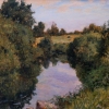 In this landscape painting, the artist conveyed the tenderness and tranquility of rural nature. The water of the stream, like a smooth mirror, reflects the dense greenery of the trees and the expanse of the heavenly clouds. The lush vegetation along the banks creates an impression of privacy and security, leaving the central part of the composition free for the smooth surface of the water. The shades of lush greenery and soft blue of the sky intertwine with barely noticeable golden flashes of the setting sun, filling the picture with the warmth and atmosphere of a summer evening. The painting seems to invite you to sit down by the banks of the stream and enjoy the slow flow of time.