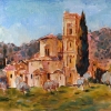 The landscape transports the viewer to the Mediterranean expanses. The focus is on an ancient abbey surrounded by cypress and olive trees, which emphasize its epochal significance. The surrounding landscape is painted in muted pink-lilac and blue tones; the mountains and sky complement the composition, creating a soft background. Light brushstrokes indicate the time of day - most likely, the sunset, when the gold of the sunset ray emphasizes the architectural details of the building, filling it with warmth and peace. This work seems to invite the viewer to enjoy the silence and charm of antiquity.