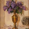The painting depicts an elegant bouquet of lilacs set in an ornate gold vase. The delicate purple flowers are detailed with soft brushstrokes that convey the texture of the petals and their wild naturalness at the same time. Soft light falls on the gold vase, giving it a glow, while the lilacs act as a symbol of spring and renewal. The warm beige and cream background creates a cozy atmosphere, making the composition simple and elegant at the same time. The painting conveys a feeling of tenderness and noble calm.