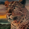 This painting depicts a majestic leopard, whose confident expression and penetrating gaze attract and fascinate. The artist skillfully conveyed the texture of its fur with characteristic spots, emphasizing the grace and natural strength of the animal. The background of the painting is made in warm, saturated sunset tones with shades of gold, pink and gray-blue.