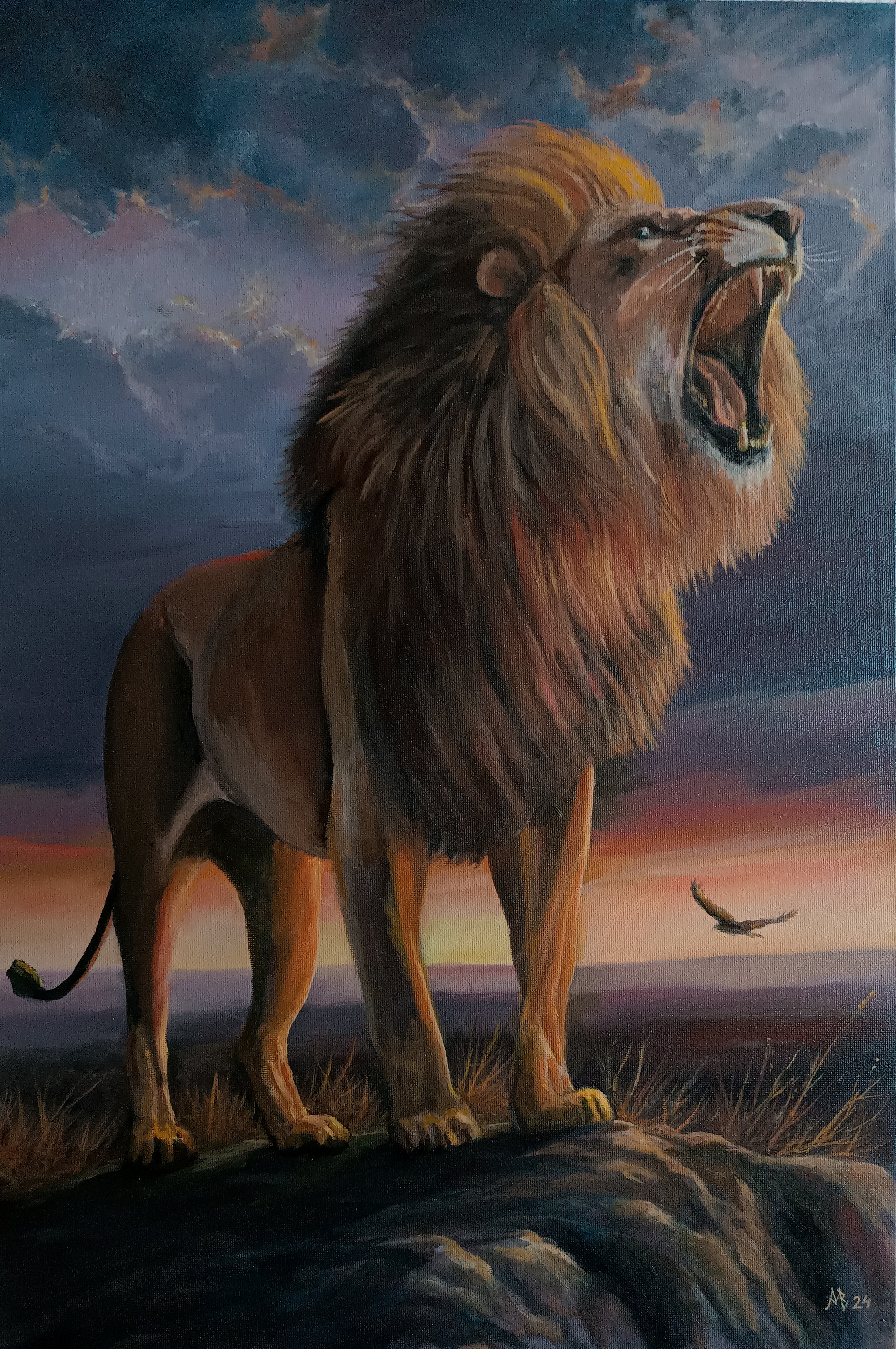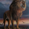 The painting conveys the majesty and power of the lion, the king of the savannah, standing on a cliff in the rays of the sunset. His figure is captured at the moment of a thunderous roar, which seems to break the silence of the distant horizon. The lion's thick mane, framed by shades of gold and brown, emphasizes his majestic appearance. In the background, you can see the sunset sky with rich purple, orange and dark blue hues that add drama and emphasize the symbolism of the power of nature. A bird flying in the distance adds a sense of scale and freedom of the African expanses. The painting radiates energy, triumph and uncontrollable grandeur of the wild world.