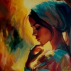На изображении представлена женщина с закрытыми глазами, задумчиво касающаяся своего лица. Она одета в светлую одежду, а на голове у неё синий платок.