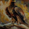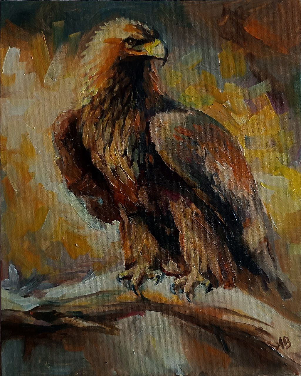 На картине изображен орел, сидящий на ветке. Птица выполнена в теплых коричневых и золотистых тонах, что придает ей величественный и благородный вид. Фон картины размыт, с преобладанием желтых и коричневых оттенков, что создает ощущение осеннего леса.