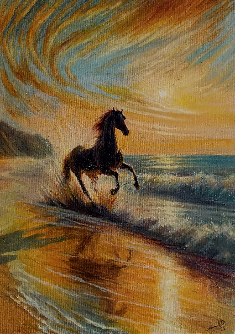 The painting depicts a dark silhouette of a horse running along a sandy beach. The horse is positioned in the center of the composition and moves from left to right. In the background, waves can be seen rolling onto the shore.