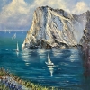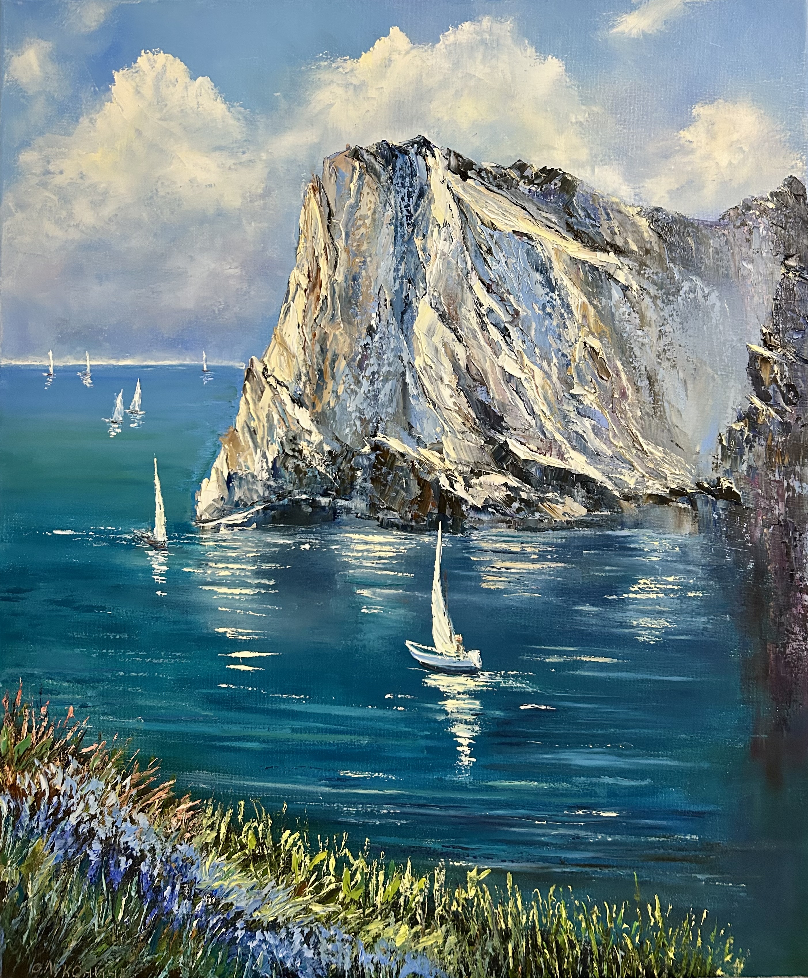 The main theme of the painting is a massive snow-white cliff, standing reliably to protect the sea. The detail of the cliff's structure emphasizes its grandeur: uneven lines, the roughness of its surface, created by centuries of winds and sea waves, add drama. The turquoise-azure water below reflects the sun's rays, creating the effect of crystal purity. Snow-white sailboats lighten the severity of the landscape, reminding us of movement and life among this natural beauty. In the foreground, delicate grasses and colorful small flowers add lyricism to the landscape, softening and emphasizing its monumentality.