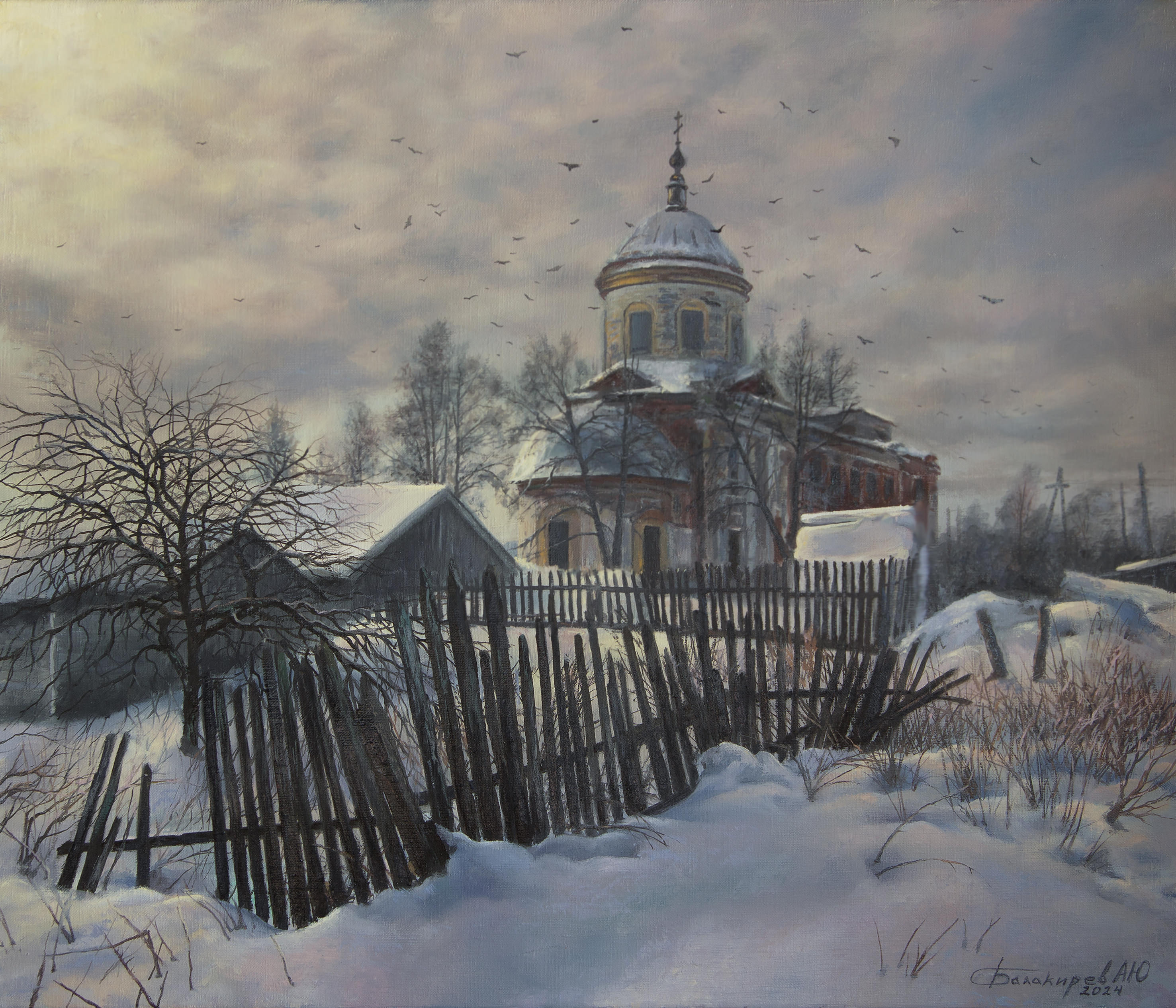 The image of a winter temple landscape is shrouded in an atmosphere of peace and cold beauty. In the foreground, an old, slanted wooden fence rises above the snow-white snow cover. In the distance, a temple is visible, lost among the bare trees, warm golden hidden sunlight. The branches soaring upward and a flock of birds in the sky create a feeling of a light, fragile swaying of the winter forest. The picture embodies loneliness and at the same time a deep spiritual meaning of the surrounding world.