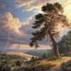 A mighty tree on a slope seems to stand guard before an approaching storm. The sunset light mixes with dark thunderclouds illuminated by a flash of lightning. In the distance, a river and forests are visible, radiating the last glimmer of the sunset light. The dynamic background of nature makes the plot of the painting lively and expressive.