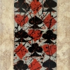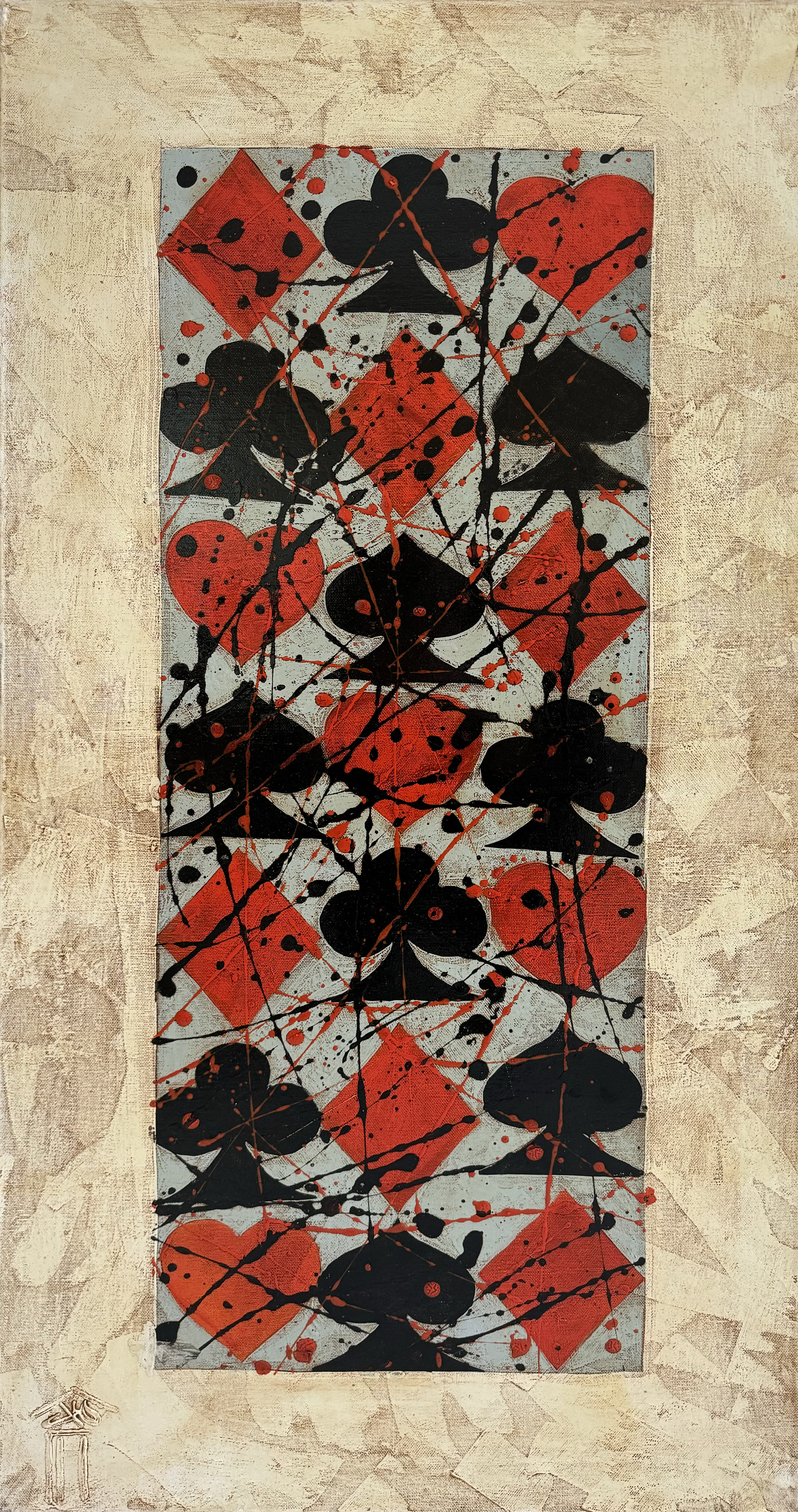 This is a work in the style of abstract expressionism, where geometric and chaotic elements are harmoniously combined. The basis of the composition is made up of card symbols - spades, hearts, clubs and diamonds, arranged in a checkerboard pattern. Contrasting red and black figures create visual tension, while the white background gives the painting lightness and air.