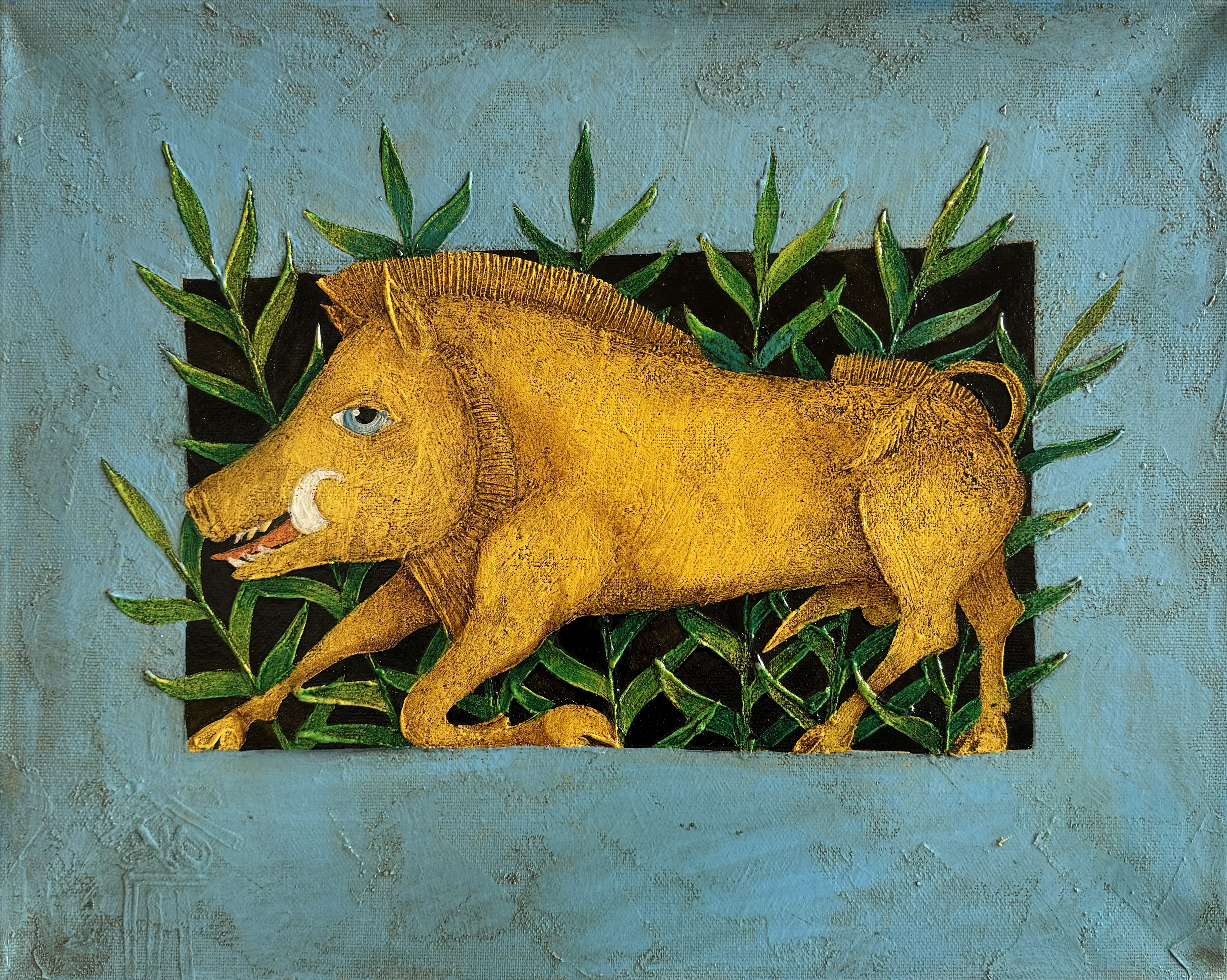The style of the artwork represents a fascinating fusion of folk art and modern sensibilities, where the interplay of light and shadow gives the composition depth and movement, as if the creature is about to leap into our reality. This painting is laden with symbolism that expresses hidden strength, grandeur, and profound metaphors. The boar symbolizes power, courage, lineage, and protection, echoing ancient animal myths that were cherished by our ancestors.