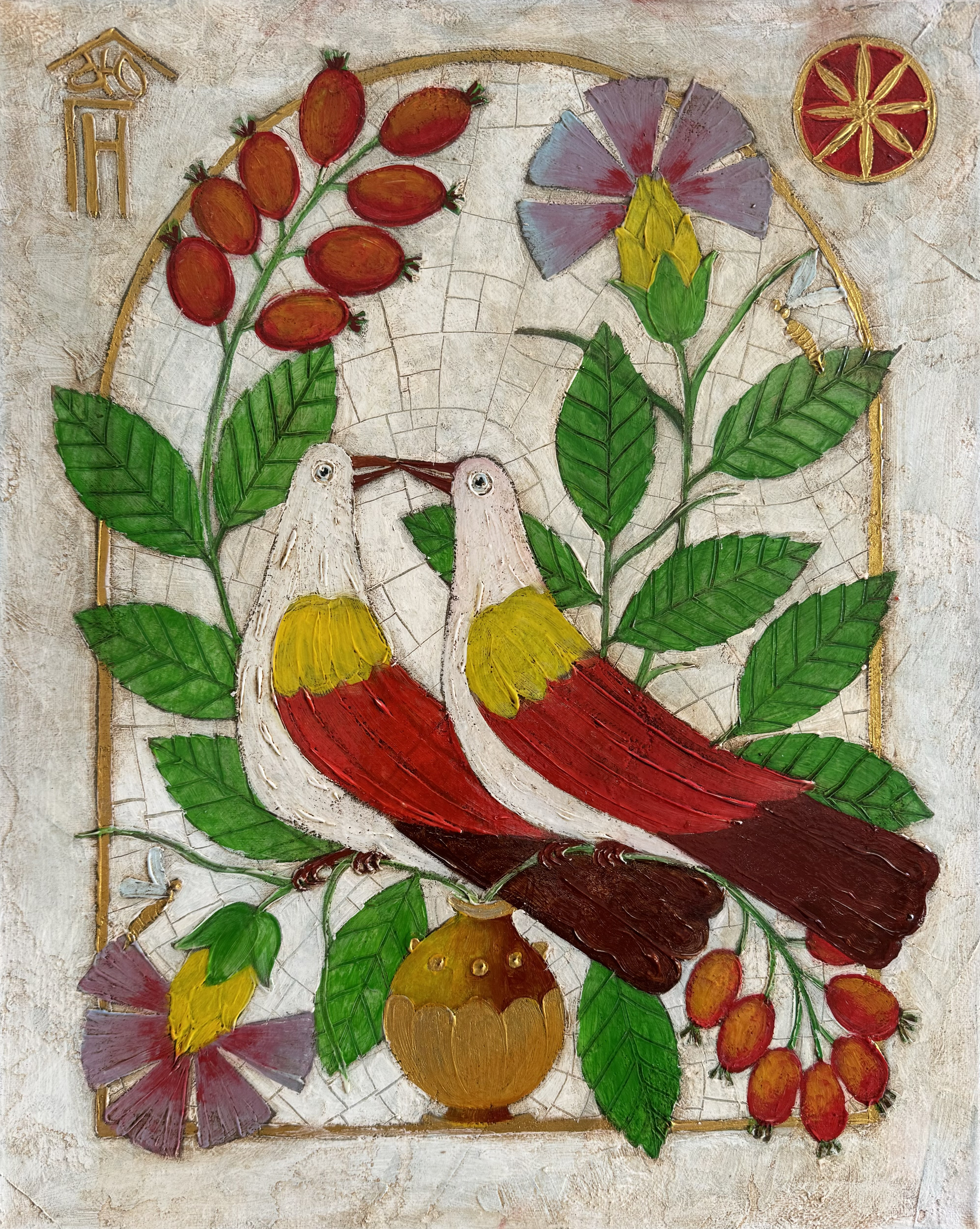 The canvas showcases two enchanting birds, surrounded by lovely leaves and blossoms. Their feathers are painted in rich shades of red, yellow, and brown. The graceful lines that define the birds give them an elegant appearance, as if they are poised to flutter their wings and serenade the world with their sweet melodies. The background features a captivating crackle effect, reminiscent of antique frescoes, which lends the piece a distinctive charm. The style of this painting can be characterized as a refined blend of folk art and a contemporary artistic approach. Decorative elements, such as golden accents, infuse the work with touches of luxury and depth, emphasizing its individuality.