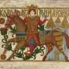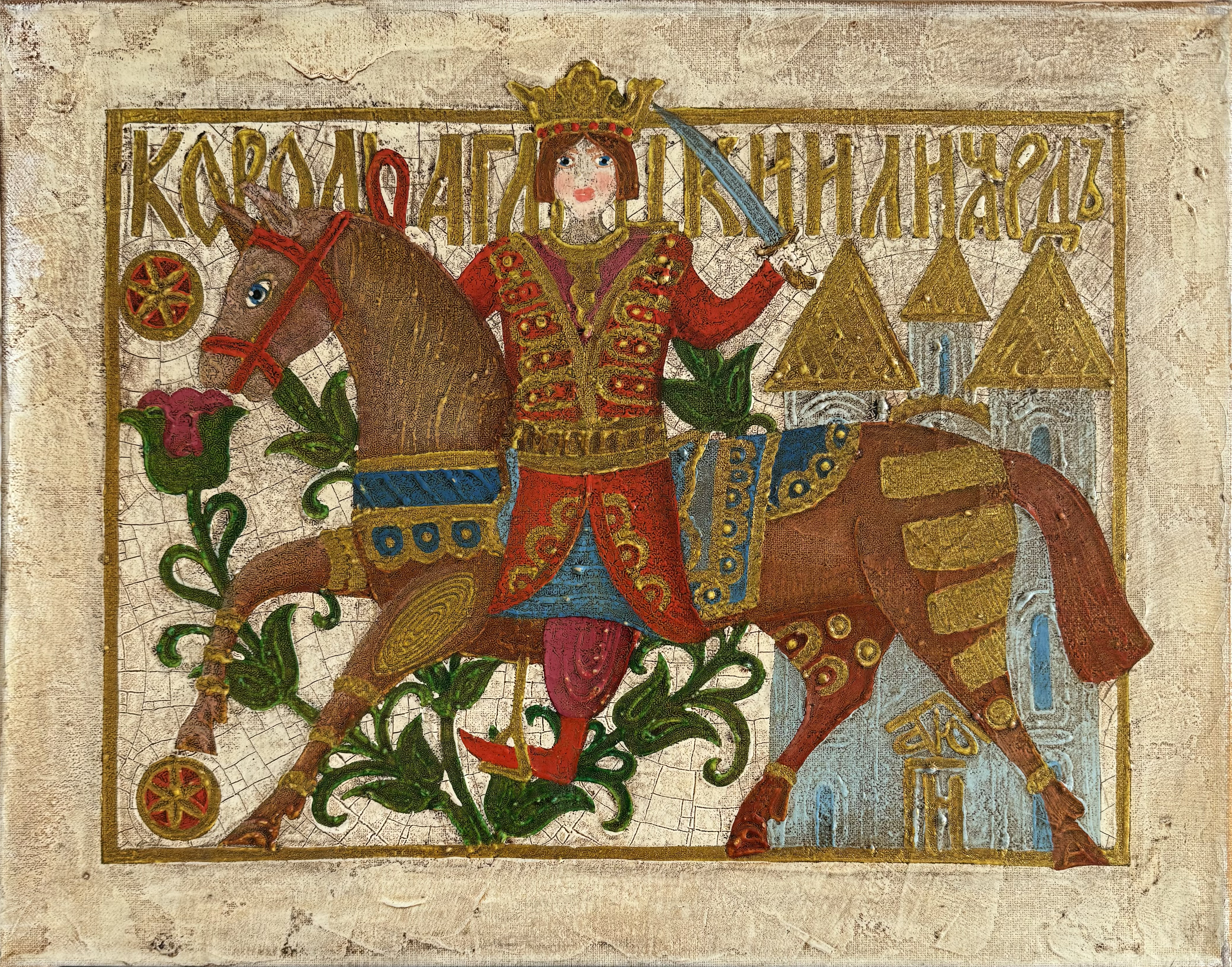 The style of this painting is a wonderful amalgamation of folk art, elements of Byzantine painting, and the artist’s distinctive flair. Warm and rich colors of red, gold, and green seamlessly blend into one another, creating an enchanting atmosphere. The golden accents gleam in the light, adding a sense of grandeur and festivity to the piece. This painting is rich with profound metaphors of valor and courage, protection and heroism, highlighting the significance of preserving one’s culture and traditions. The knight embodies ideals of loyalty, bravery, nobility, and honor, inspiring a sense of national spirit and pride in one’s heritage. Legends and tales of self-sacrifice and bravery are deeply woven into this magnificent portrayal.