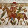 The painting depicts a character from Russian folklore - a good fellow in a rich red caftan with a gold ornament, a long moustache and a hat, sitting on a beautifully decorated horse. The composition is made in the style of old Russian popular prints and folk paintings, with a rich ornamental design.