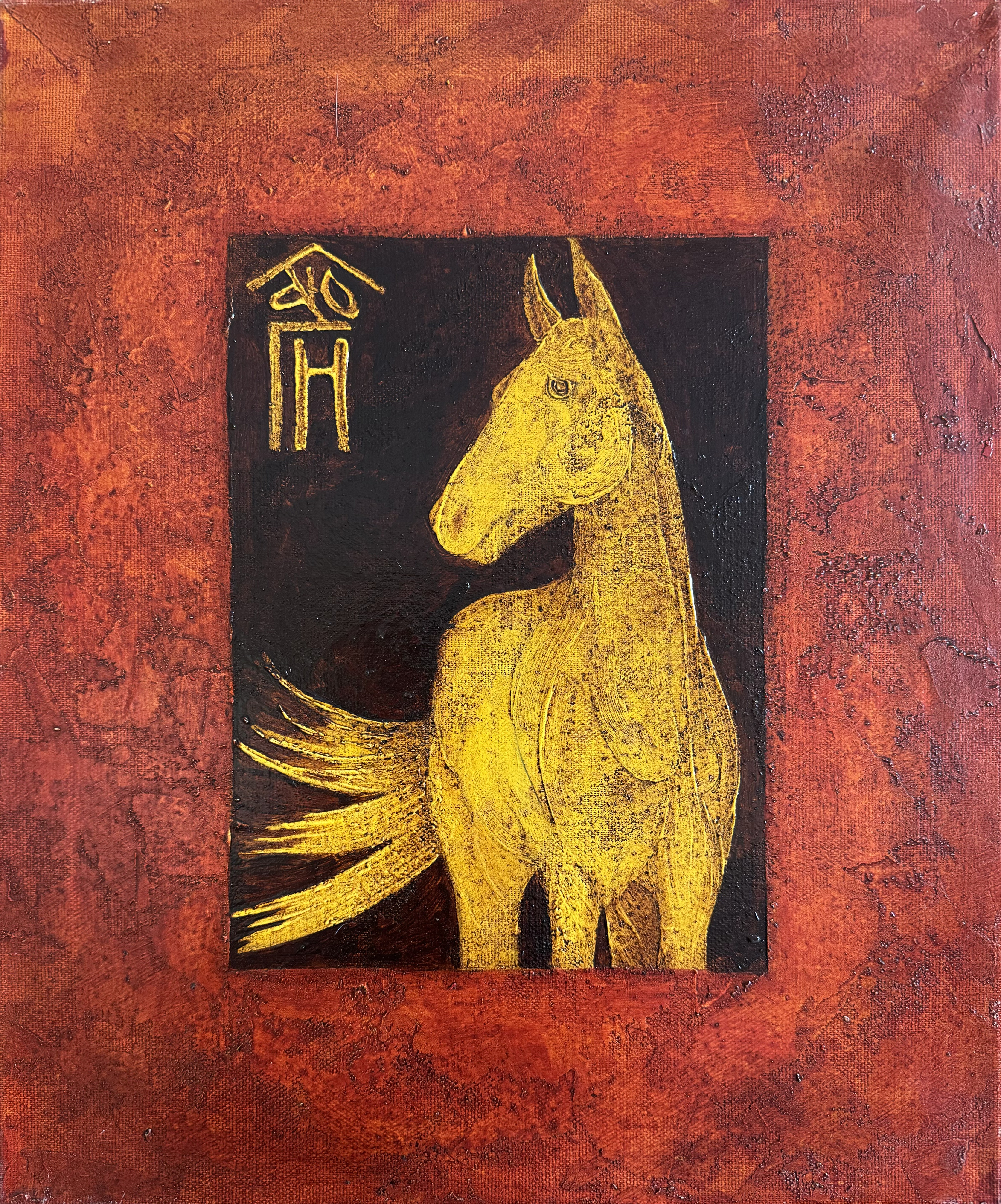 This original artwork "Horse" was created by contemporary Russian artist Vyacheslav Gayun in 2024 and is available for sale online. The painting’s distinctive style skillfully intertwines modern artistic methods with elements of traditional folklore, establishing a connection between the past and the contemporary. Rendered in a breathtaking palette of rich reds and shimmering golds, the background immerses the viewer in an ambiance filled with passion and intensity. Its lush, textured surface evokes a sense of ancient artistry, enticing you to reach out and experience its tactile nature.