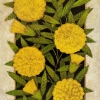 This painting depicts bright yellow asters, with exquisitely carved petals and rich green leaves. The composition is made in a decorative style with elements of realism. The background of the painting is divided into two contrasting fields: a dark rectangle in the center highlights the flowers, and a light frame around the perimeter gives the work a finished look. Careful elaboration of details, such as the texture of the petals and the veins on the leaves, enliven the image and make it rich. This work creates an atmosphere of warmth and joy, attracting attention with bright natural motifs.
