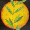 This painting is done in an abstract-decorative style and conveys a harmonious combination of natural and cosmic motifs. Against a deep black background stands out a large circle, painted in warm yellow-orange shades, reminiscent of the sun or the moon. A thin branch with green leaves passes right through this circle, symbolizing life, nature and growth.