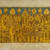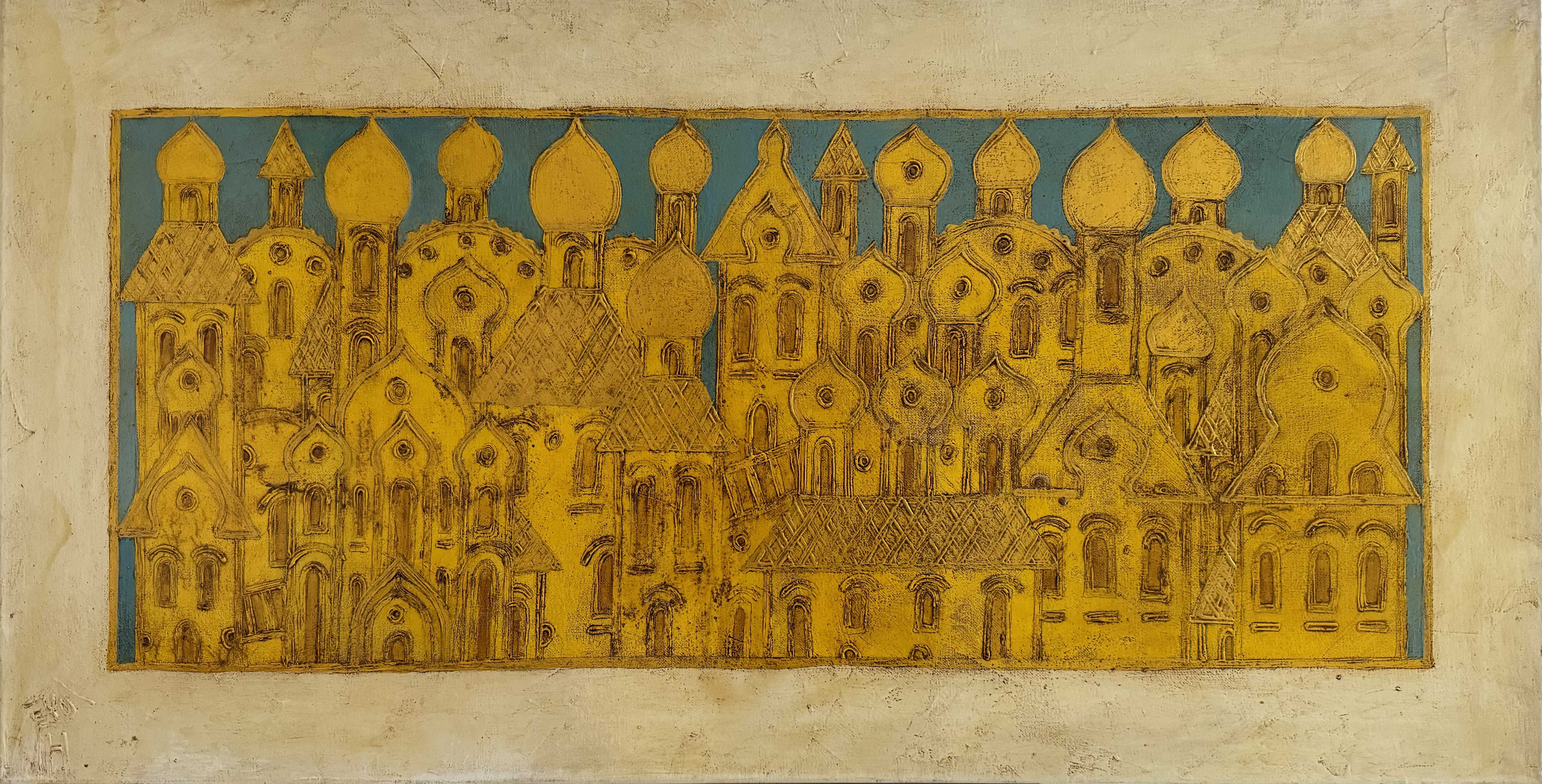 Inspired by the architectural traditions of ancient Rus', this painting depicts a fantastic city consisting of majestic temples and churches with refined domes. The main shades of gold and blue create the effect of sacred iconography, emphasizing the grandeur and spiritual heritage of this place.