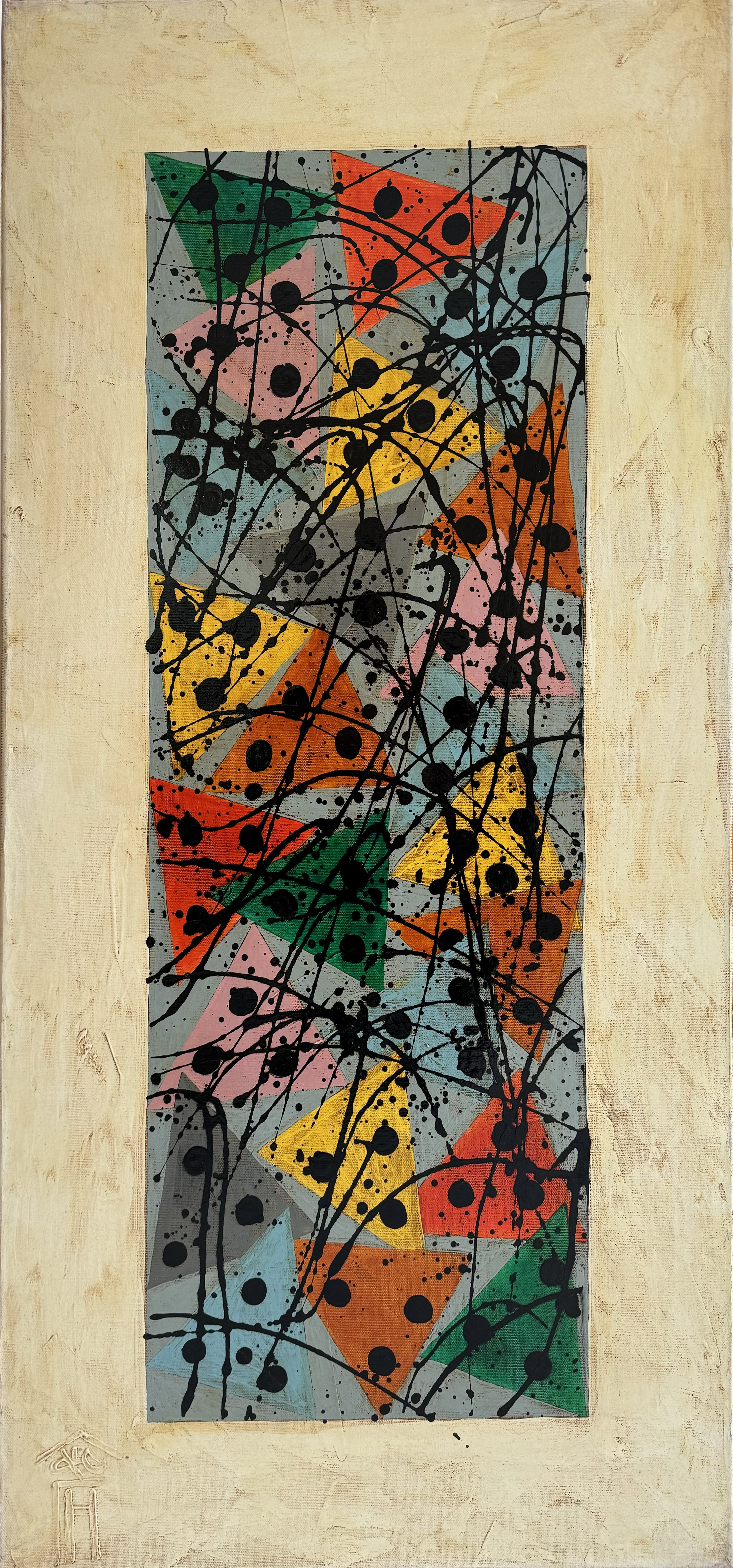 This abstract art painting is a vibrant combination of geometric triangles in pastel and rich colors of yellow, orange, pink, blue and green. Each figure is decorated with numerous black dots, creating a sense of rhythmic pattern and graphic harmony.