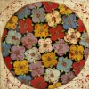 This painting is a circular composition, saturated with bright shades of red, yellow, blue, lilac and white, surrounded by green leaves. The flowers are skillfully distributed on a black background, creating a striking contrast that emphasizes their painterly nature.