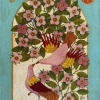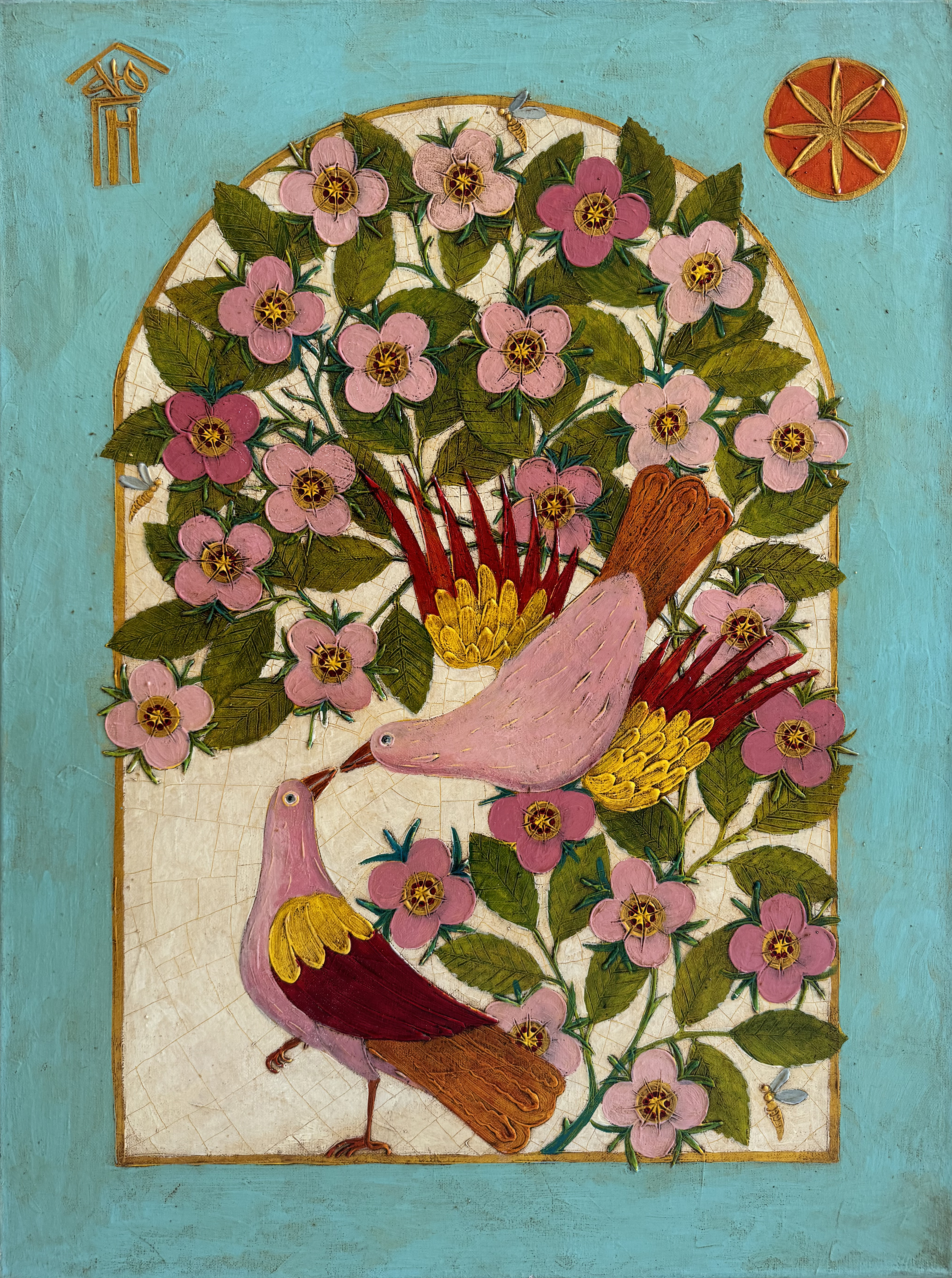 The painting bursts with energetic colors: the warm pink and purple hues of the blossoms stand out against a calming turquoise background. Glistening golden accents bring a touch of elegance and fairy-tale allure, while the enigmatic patterns resonate with ancient traditions and symbols that appeal to the unconscious mind. Two birds, representing love and unity, gracefully nestle amidst the flowering landscape, suggesting the existence of a fragrant paradise within every living heart. The blossoming flowers, eager for warmth, symbolize hopes and dreams that infuse life with brightness and purpose.