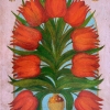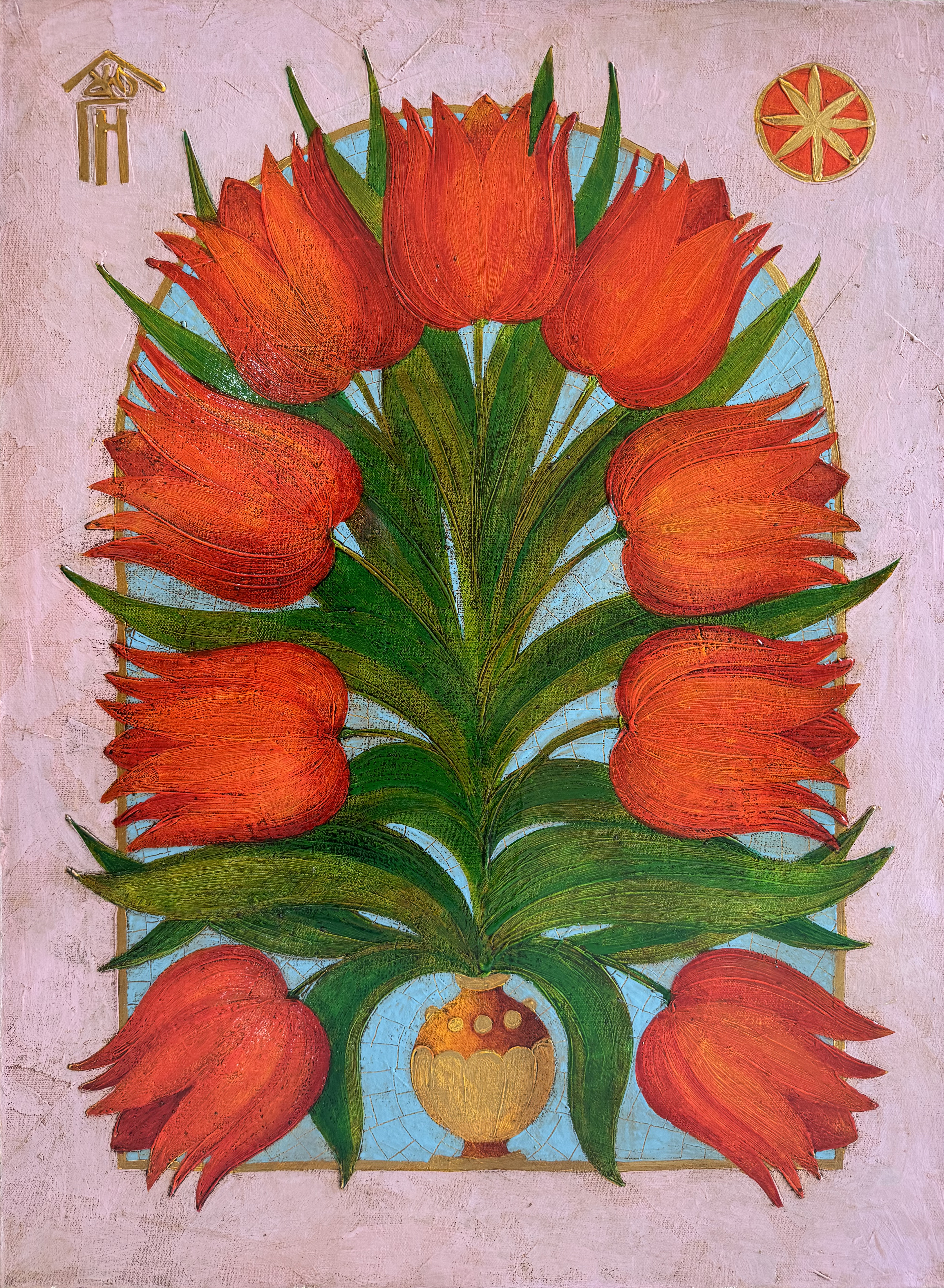 This painting is executed in the traditional style of Russian folk art. A captivating bouquet of red tulips, arranged symmetrically, grows from a vase against the background of an arched blue space. The shapes of the flowers go back to traditional motifs of folk decorative art, personifying harmony, vitality and beauty of nature.