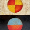 - The top circle is divided into four equal sectors, two of which are painted red and two are yellow. The background around the top circle has a light, warm beige-brown texture.