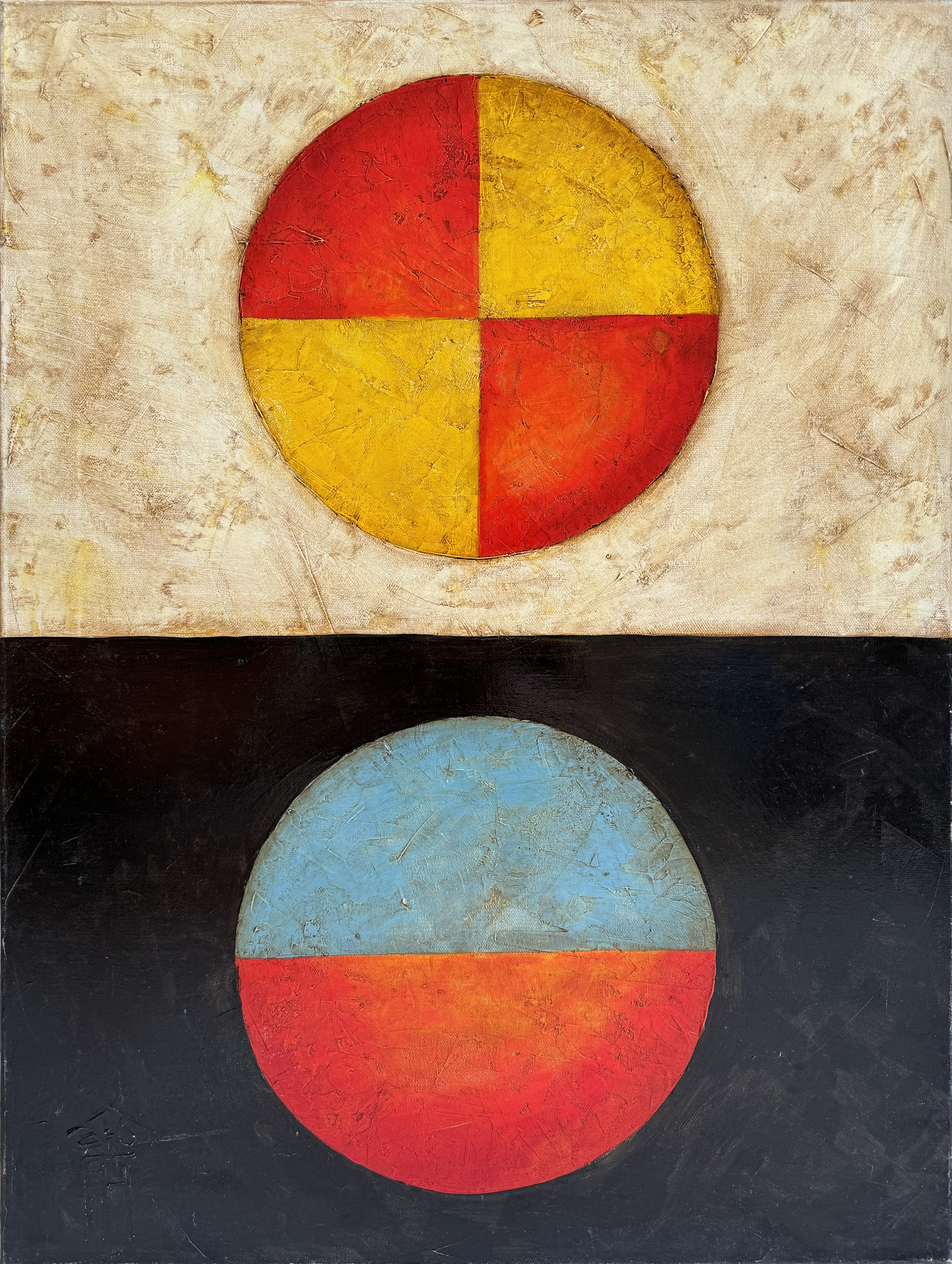 The painting depicts two circles, one above the other, on a contrasting background.