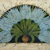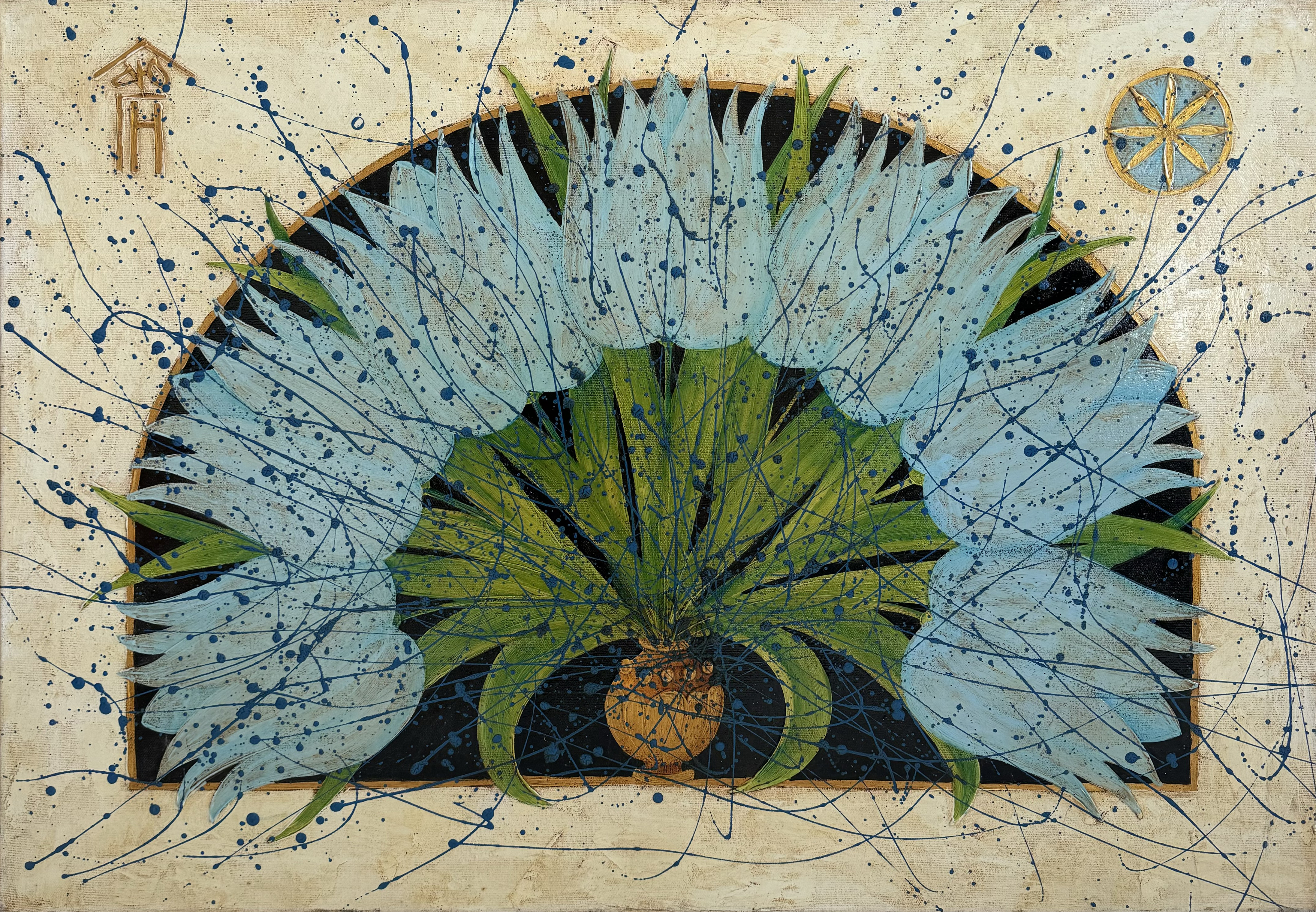 This painting is done in the style of symbolism and decorative painting with elements of abstraction. In the center of the composition is a stylized plant motif reminiscent of a flower or foliage growing out of a small clay pot. The semicircle format creates the impression of symmetry and harmony.