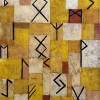 The colored blocks depict black symbols reminiscent of runic signs. These elements refer to ancient alphabets, such as Scandinavian runes, which gives the painting a mystical and mysterious aura. The use of such runic symbols serves as a kind of encrypted message or reflection of ancient wisdom and traditions.