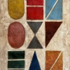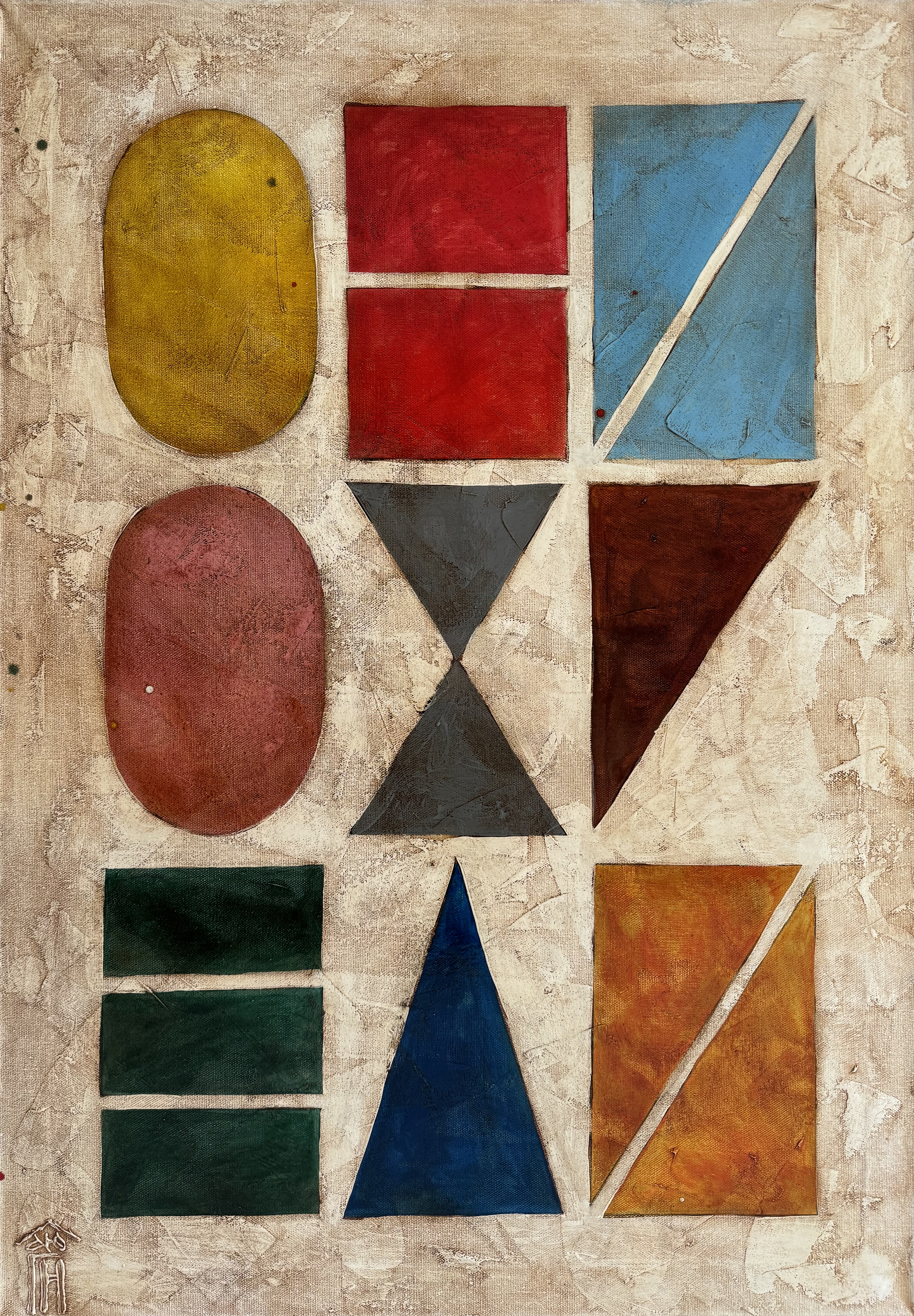 This painting is an abstract composition in the style of geometric art. The canvas depicts various geometric shapes - rectangles, triangles, polygons and ovals - evenly distributed over a grid of nine segments. The main colors of the painting - red, blue, yellow, green, brown and black - create a bright contrast against a neutral light beige background with texture.