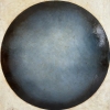 This work is done in the style of minimalism and abstraction. The central element of the composition is a large ball of a dark blue shade with smooth gradient transitions, creating the effect of depth. It is surrounded by a light, warm background, filled with textured strokes, reminiscent of an old, cracked surface.