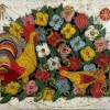 The background of the painting is saturated with thick flowers of bright tones: red, yellow, blue, pink and white. The leaves are decorated with decorative patterns and small gold dots, creating a feeling of richness and sophistication. The work is executed in a traditional technique characteristic of folk art, which resembles the Ukrainian or Petrykivka style of painting.