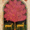 In the lower part of the image, you can see two golden antelopes, gracefully standing on either side of the tree. Their poses are graceful and harmonious, which gives the picture a sense of symmetry and balance. Green grass spreads around them, adding liveliness and naturalness to the composition.