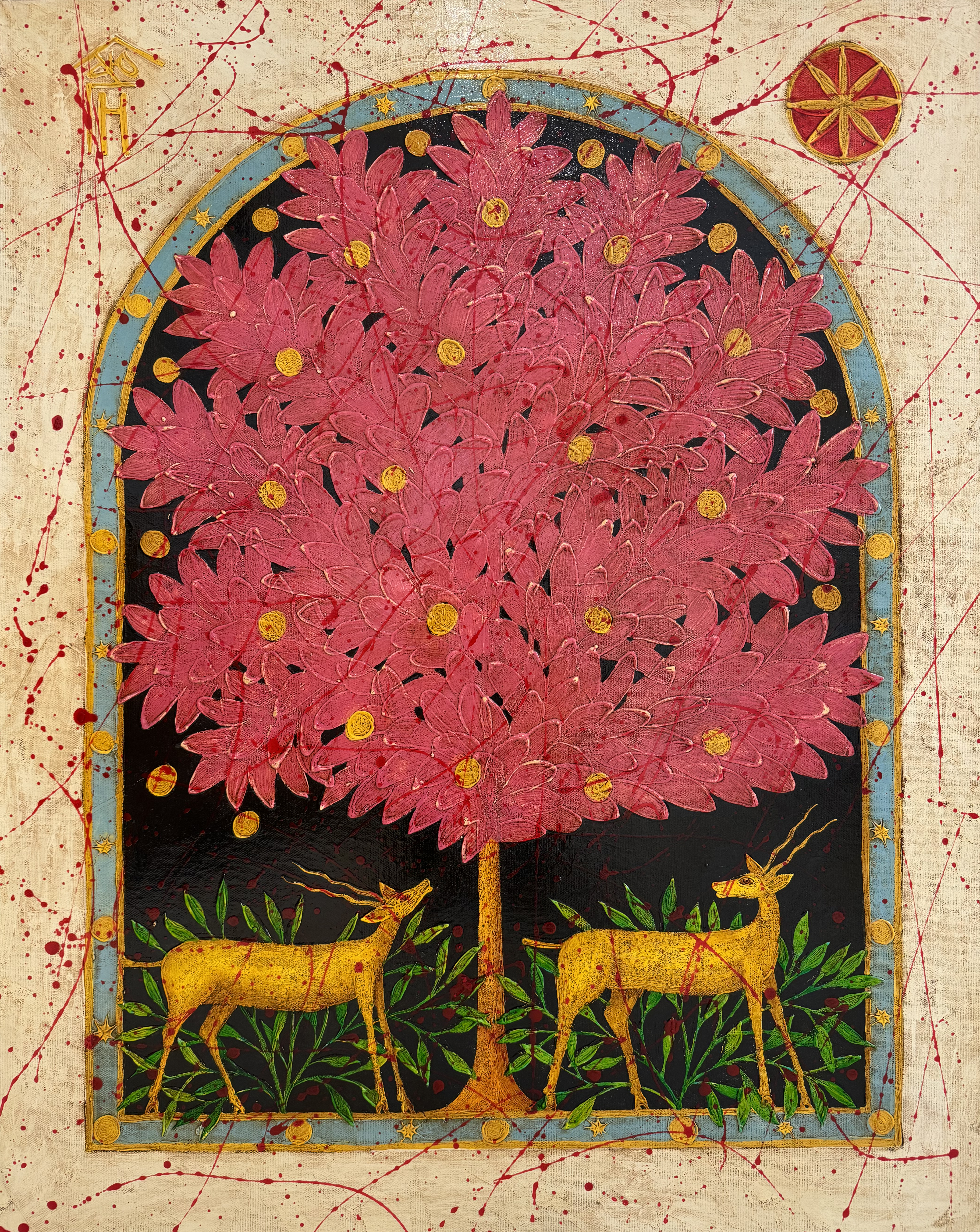 The arched window that limits the central scene creates an atmosphere of mystical space, as if the viewer is looking into a fairy-tale world or mythical reality. The external background with chaotic red splashes brings dynamics and expression, giving the work a modern feel.