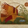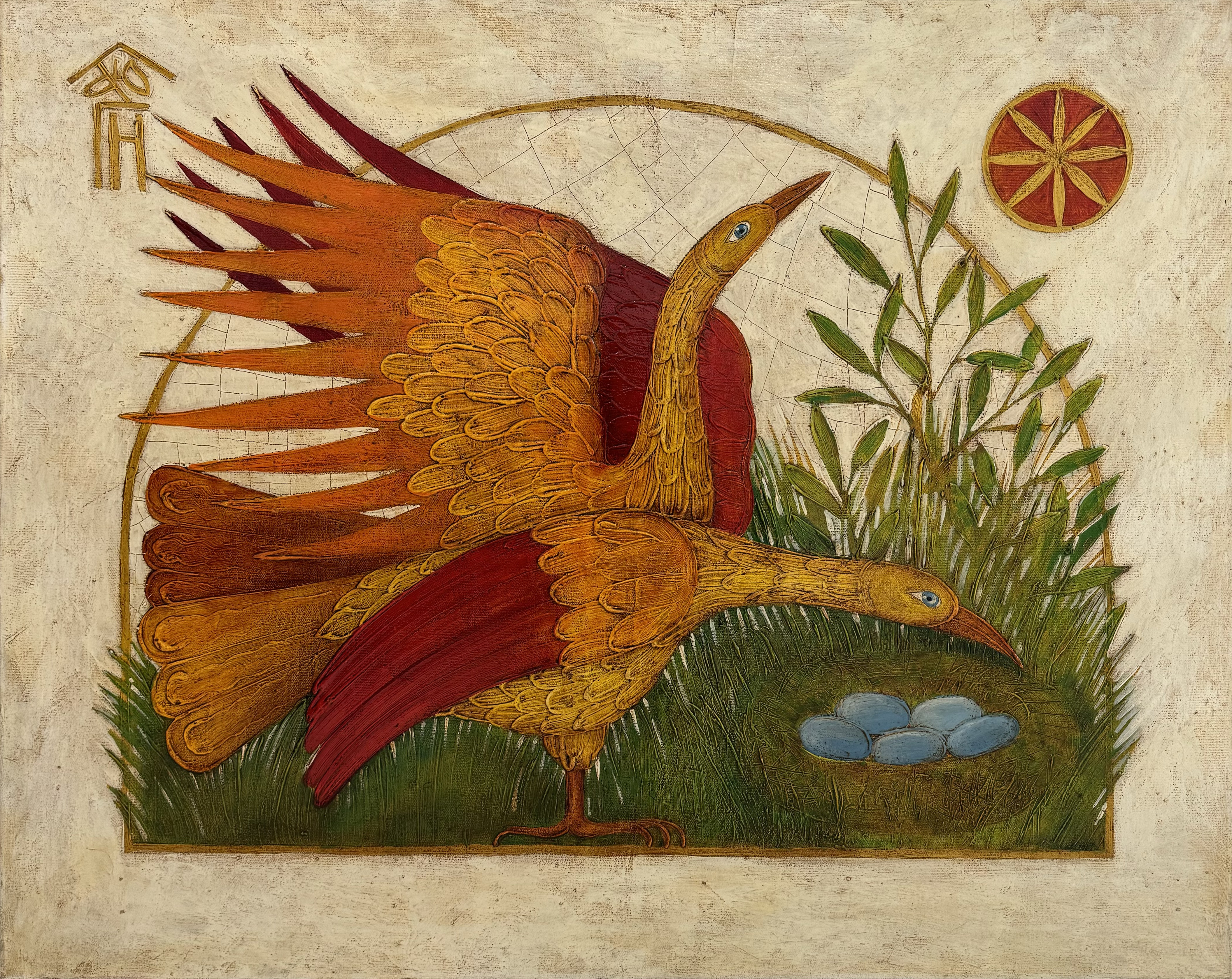 The painting, executed in traditional folk art, depicts two bright birds that represent strong family ties, care and procreation. The warm shades used - gold, orange and burgundy - create an atmosphere of warmth, protection and harmony. One of the birds stands near its nest, carefully guarding the clutch of eggs, symbolizing new life. The second bird spreads its wings, as if covering the family from external dangers, giving the whole composition dynamism and depth.