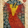 The background of the painting is decorated with a decorative pattern of blue flowers, which contrasts with the rich and bright tones of the bird itself. The arched element in the composition adds depth and symbolic meaning, referring to ancient iconographic traditions. Splashes of paint on the surface add dynamism and a sense of movement, creating the impression that sparks are flying around.