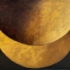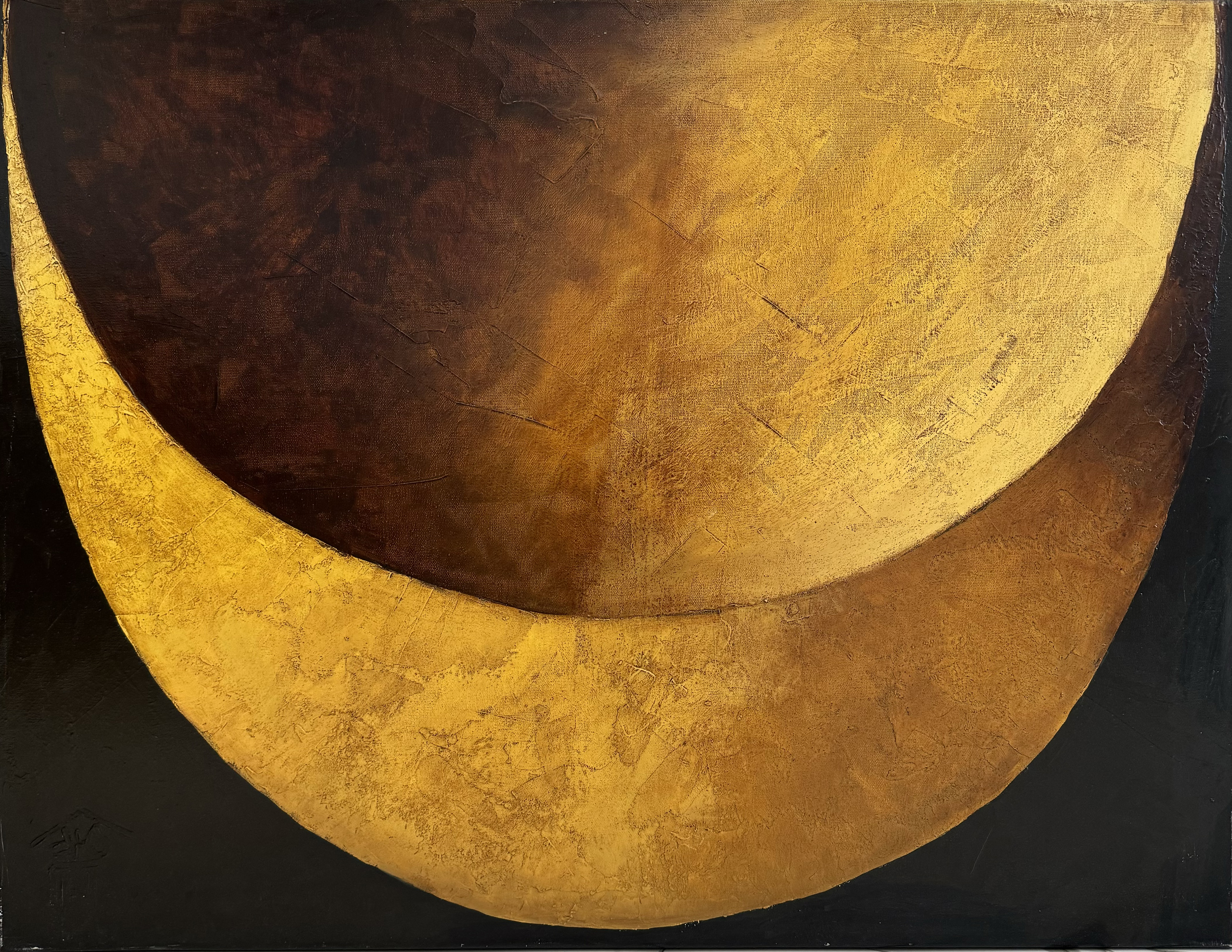 The painting titled "Bowl" is an exquisite abstraction made in deep gold, brown and black shades. The composition consists of two intersecting semicircular shapes that create a volume effect, playing with light and shadow.