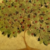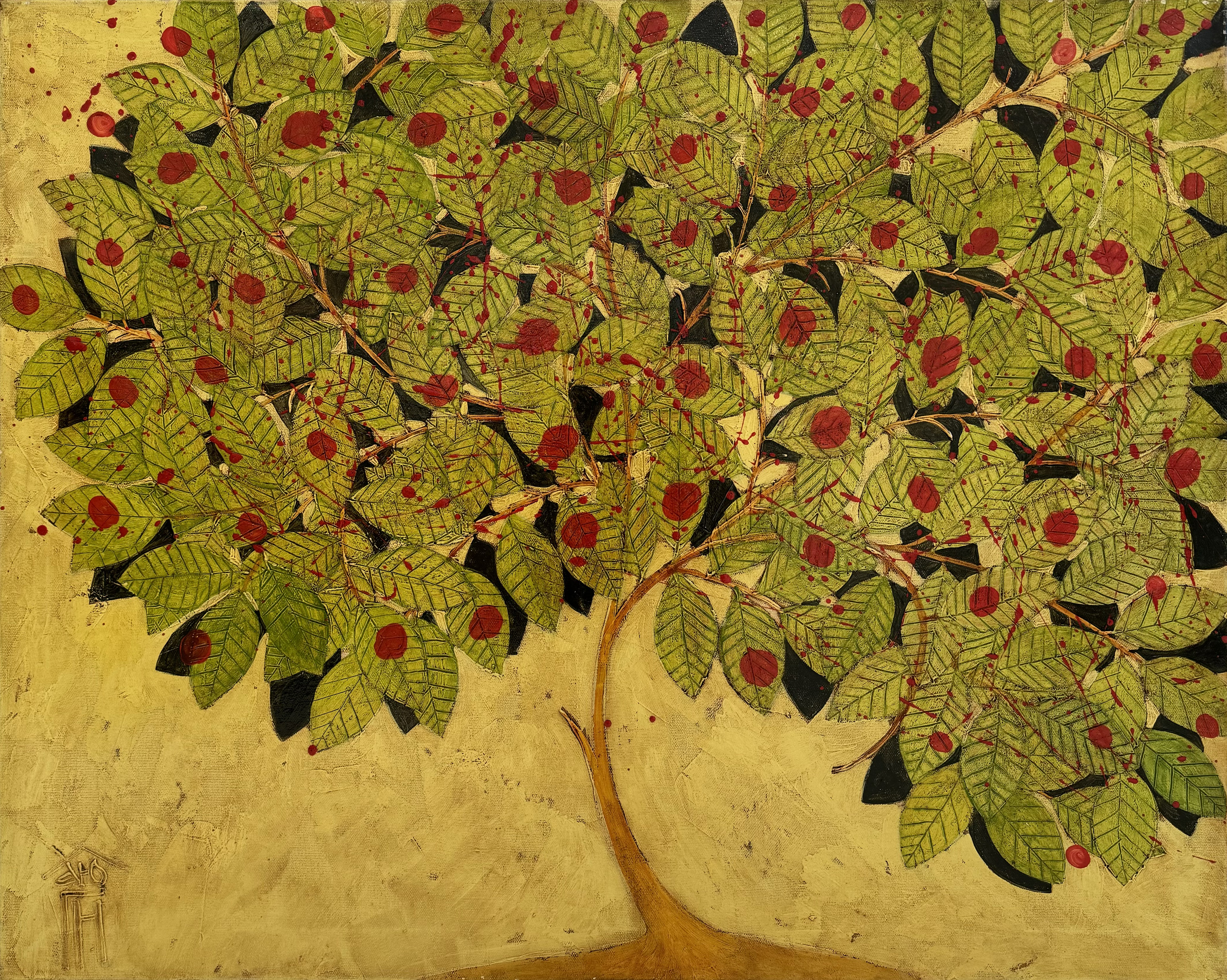 This painting depicts a majestic, spreading tree, enthusiastically spreading its lush branches. The leaves, carefully drawn with bright accents, create a feeling of lightness and freshness, while the bright red fruits, among the greenery, add dynamics and contrast. The background, made in warm sand tones, gives the work a cozy and calm atmosphere. Fine lines and decorative elements give the painting a character reminiscent of naive art with the influence of traditional painting. This artistic image radiates vital energy and harmony, symbolizing the abundance and beauty of nature.