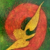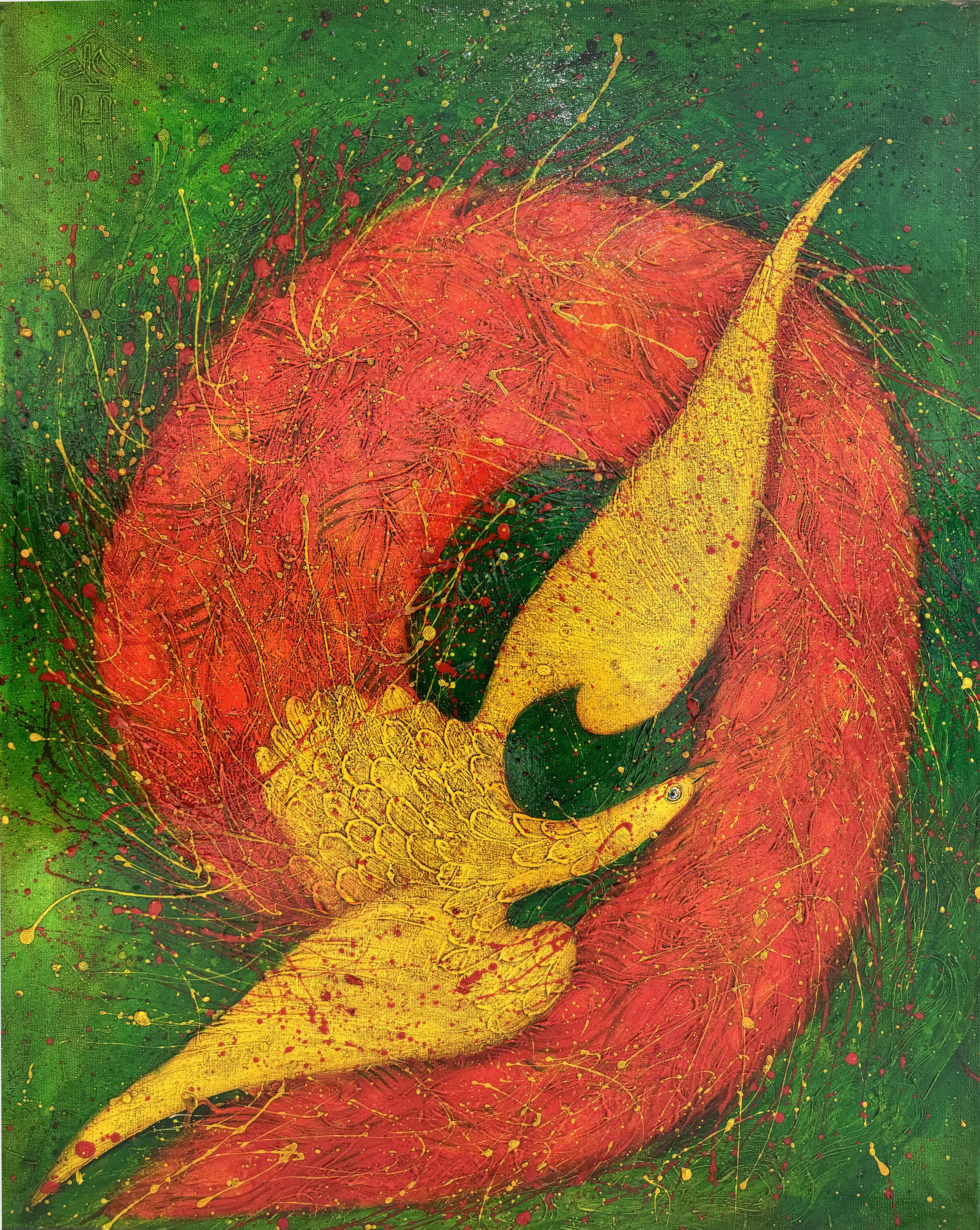 This abstract work is a dynamic composition, full of vibrant colors. The focus is on a golden figure, reminiscent of a bird with outstretched wings, rushing forward. It is elegantly surrounded by a red ring, creating an impression of movement and energy. The background of the painting is done in deep green shades, complemented by chaotic splashes of bright colors, which gives the painting a lively and expressive feel. This work symbolizes freedom, flight and the endless flow of life.