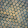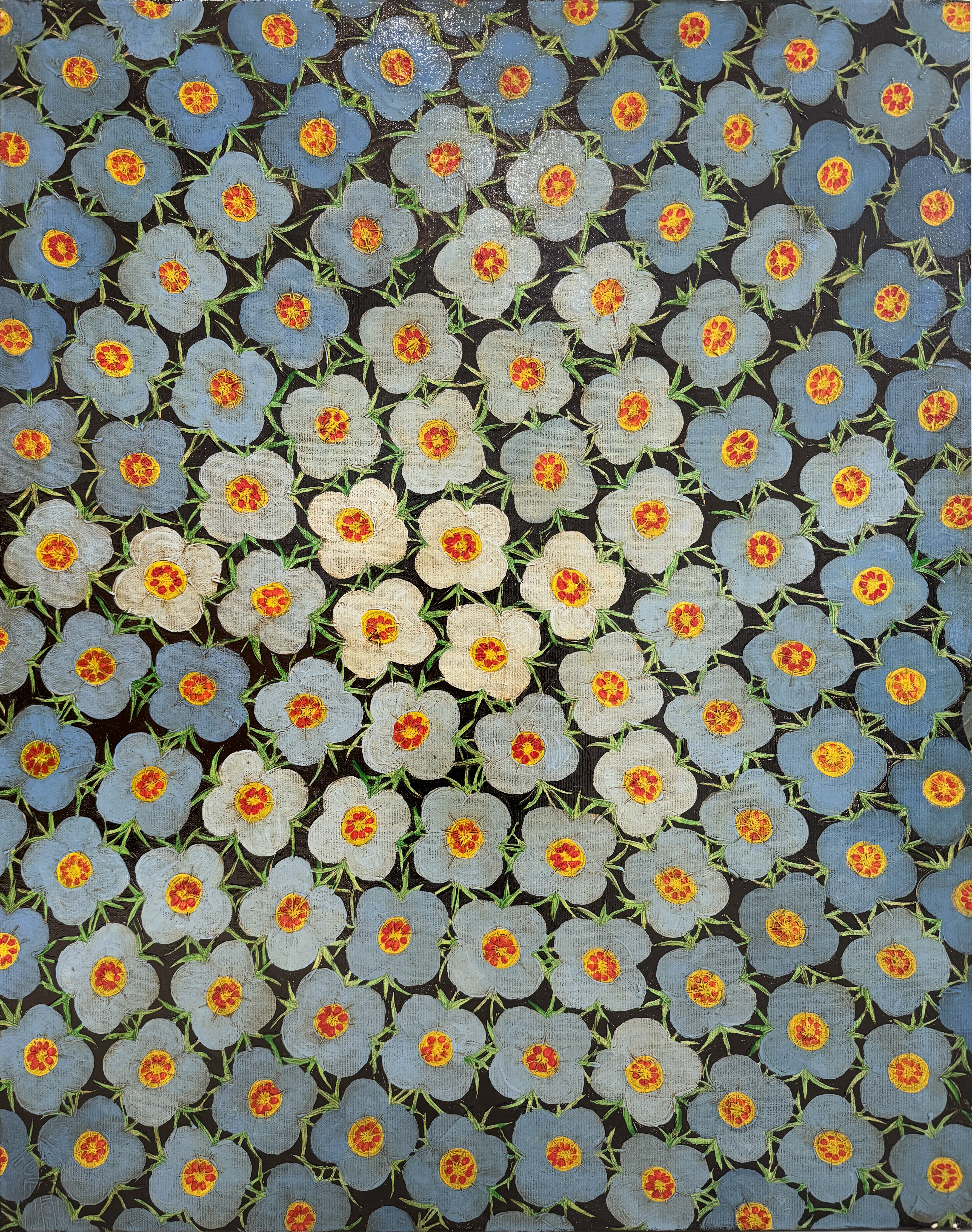Each flower is carefully detailed and decorated with red-orange cores that attract the eye and fill the picture with warmth and energy. Clear symmetry and repeating pattern give the work a meditative and decorative character, while the gradients passing from the center to the edges make it lively and expressive.