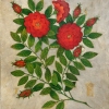 This botanical illustration depicts a branch of a rose bush, abundant with bright red flowers and green leaves. The composition is symmetrical and richly detailed, each petal and leaf seems to come alive thanks to the careful study of texture and form.