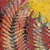 This painting is a vibrant and dynamic composition that organically combines elements of nature and expressionist painting techniques. The center of the composition is rich vegetation, depicted as multi-layered multi-colored leaves. The palette works with deep reds, blues and soft pastels, creating an impressive visual effect.