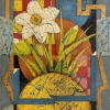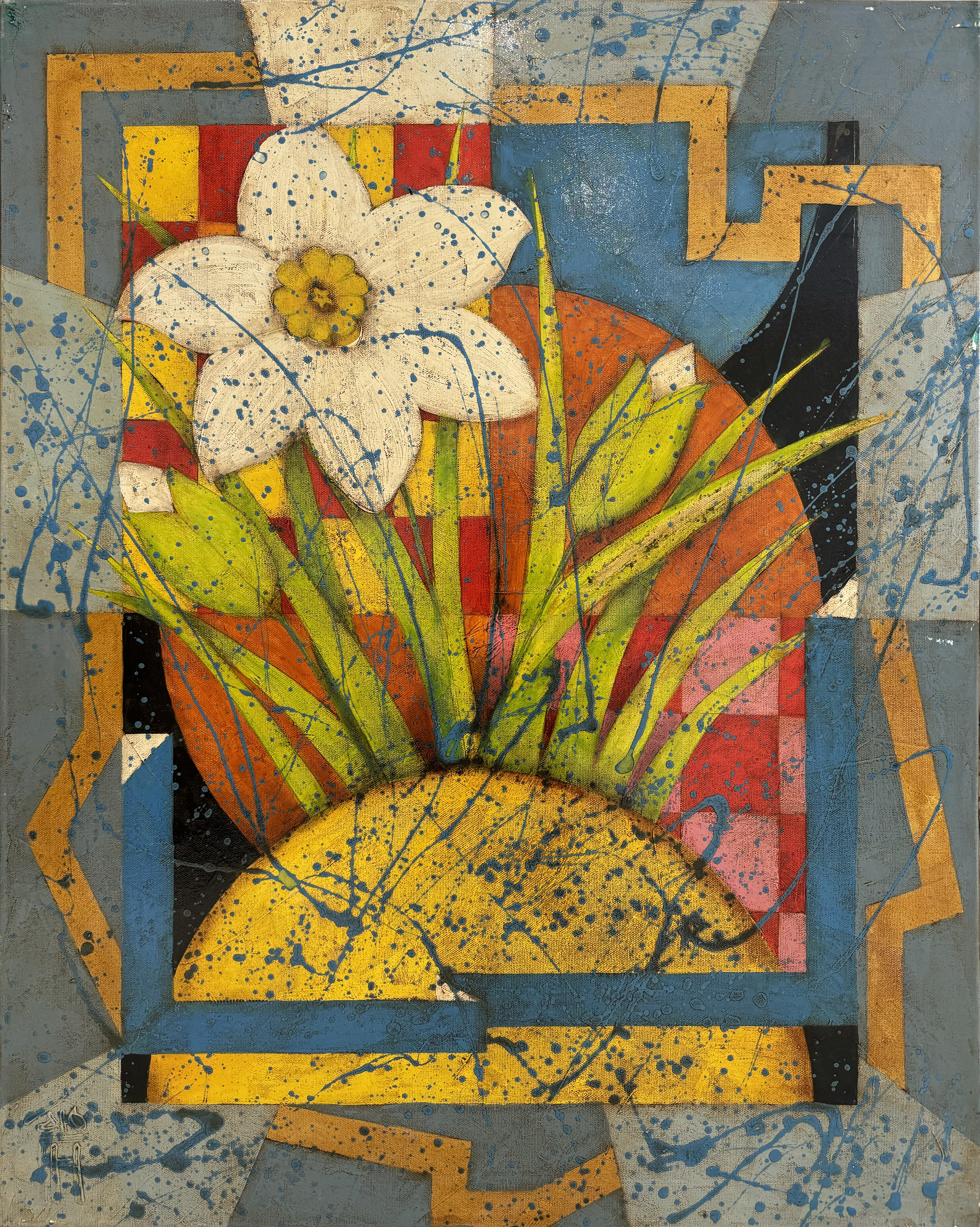 This painting is a vibrant and expressive composition that combines elements of abstraction and still life. The focus is on the white narcissist, which harmonizes beautifully with the green leaves and stems that reach upwards. The background of the painting is filled with rich red, blue, yellow and orange hues that form dynamic geometric shapes, giving the work a multi-layered structure.