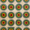 This work is a geometric abstraction, featuring an exquisite composition of repeating patterns of concentric circles in vibrant red, yellow, green and blue. The warm beige background, complemented by textural elements, creates an aged effect, adding depth and character.