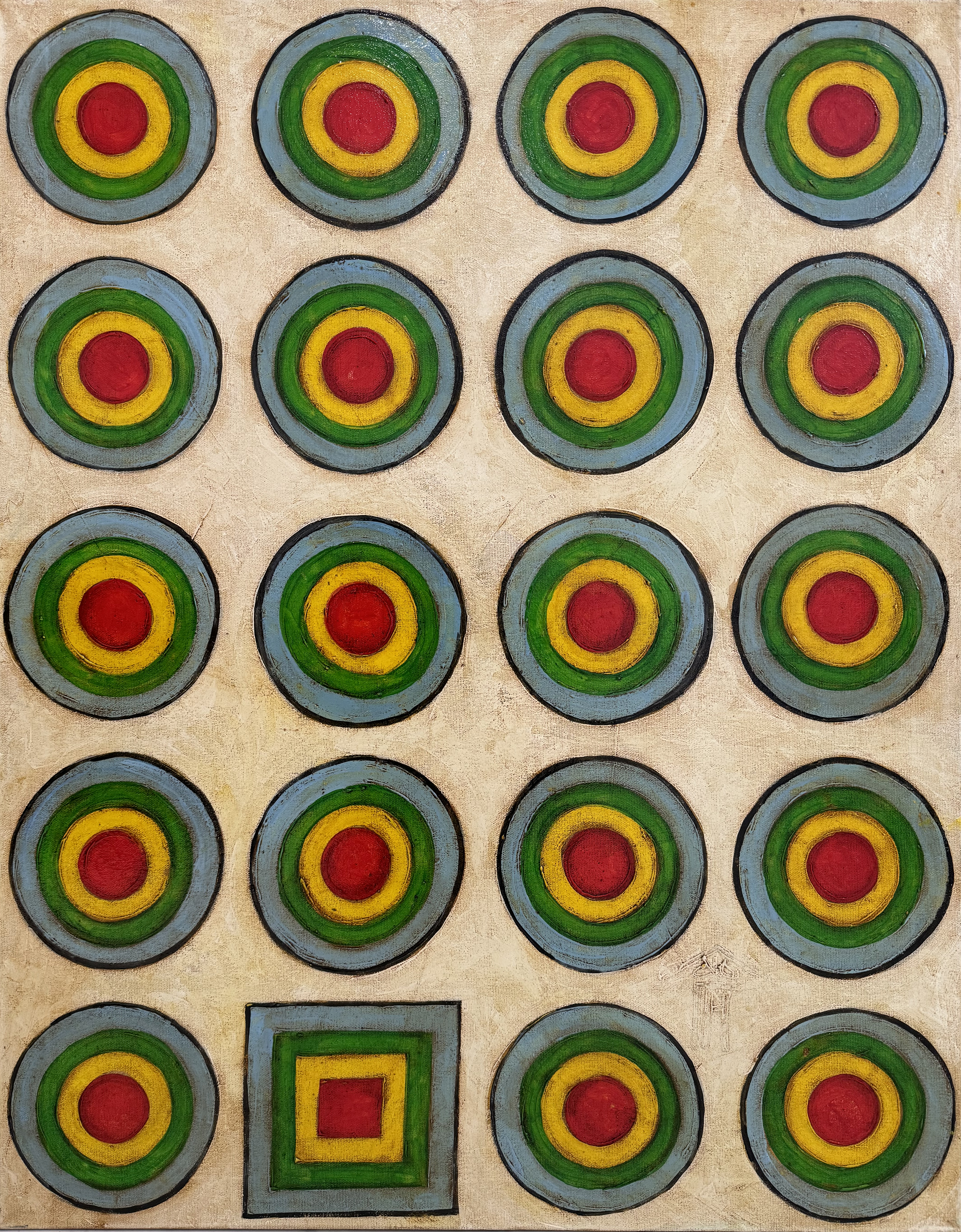 The central idea of the painting is the strict grid order of the figures, but one element in the bottom row, instead of the usual circle, is presented in the form of a square with a similar color scheme. This bold decision disrupts the rhythmic symmetry of the work, introducing surprise and emphasis, which prompts the viewer to reflect on the nature of harmony and incongruity.