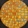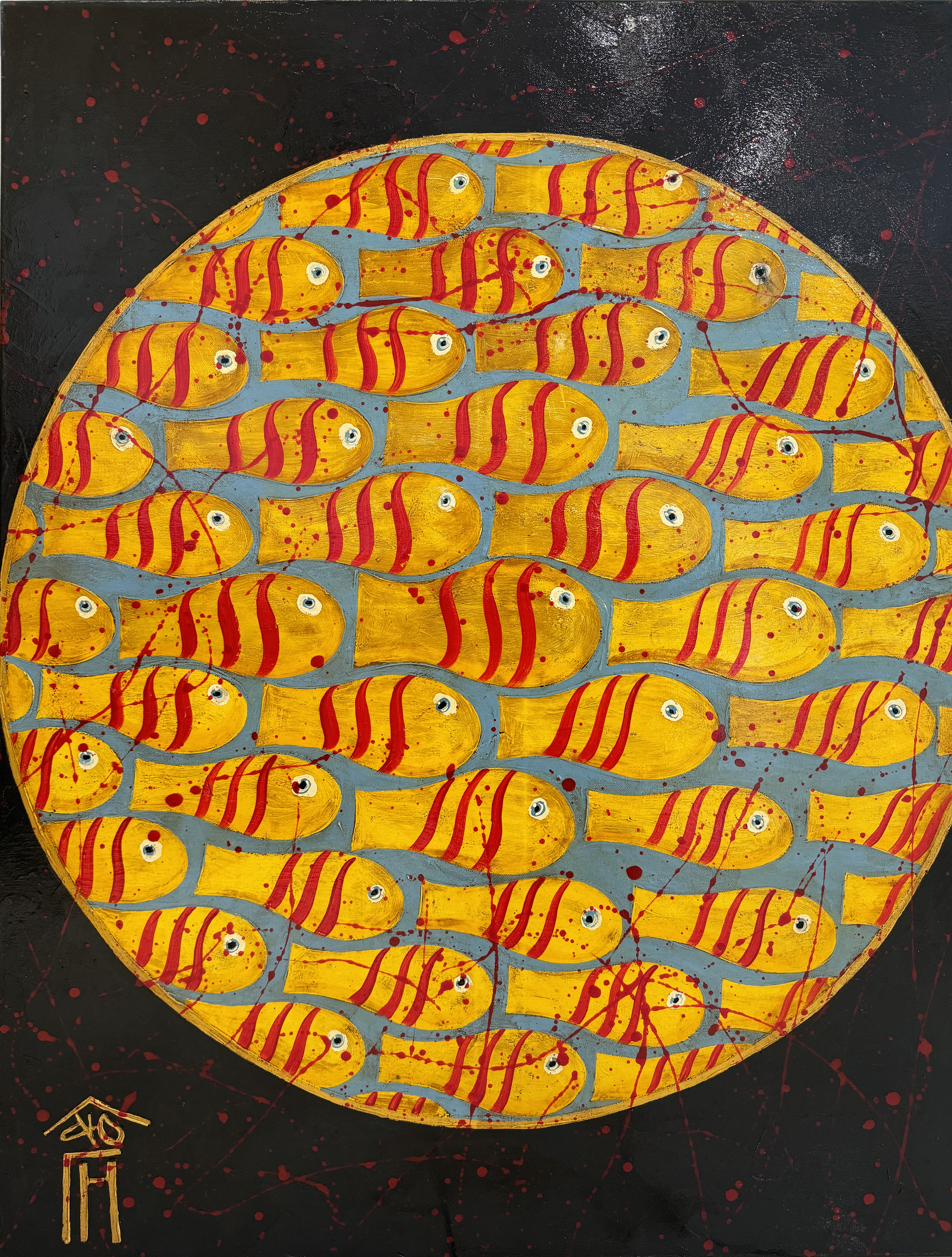 The painting presents a stylized composition, in the center of which are bright golden-yellow fish with red stripes, tightly gathered in a circle. Their expressive eyes, highlighted with white dots and black pupils, create the impression of lively movement. The background of the fish is a soft gray-blue color that contrasts with the brightness of their bodies, emphasizing their dynamic interaction.