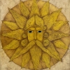 The painting depicts a symbolic sun, represented as a face with a thick beard and a thick moustache, whose features smoothly flow into the rays of light. The work is done in warm golden-yellow shades, creating the effect of a bright glow and giving the image a mythological and mysterious character.