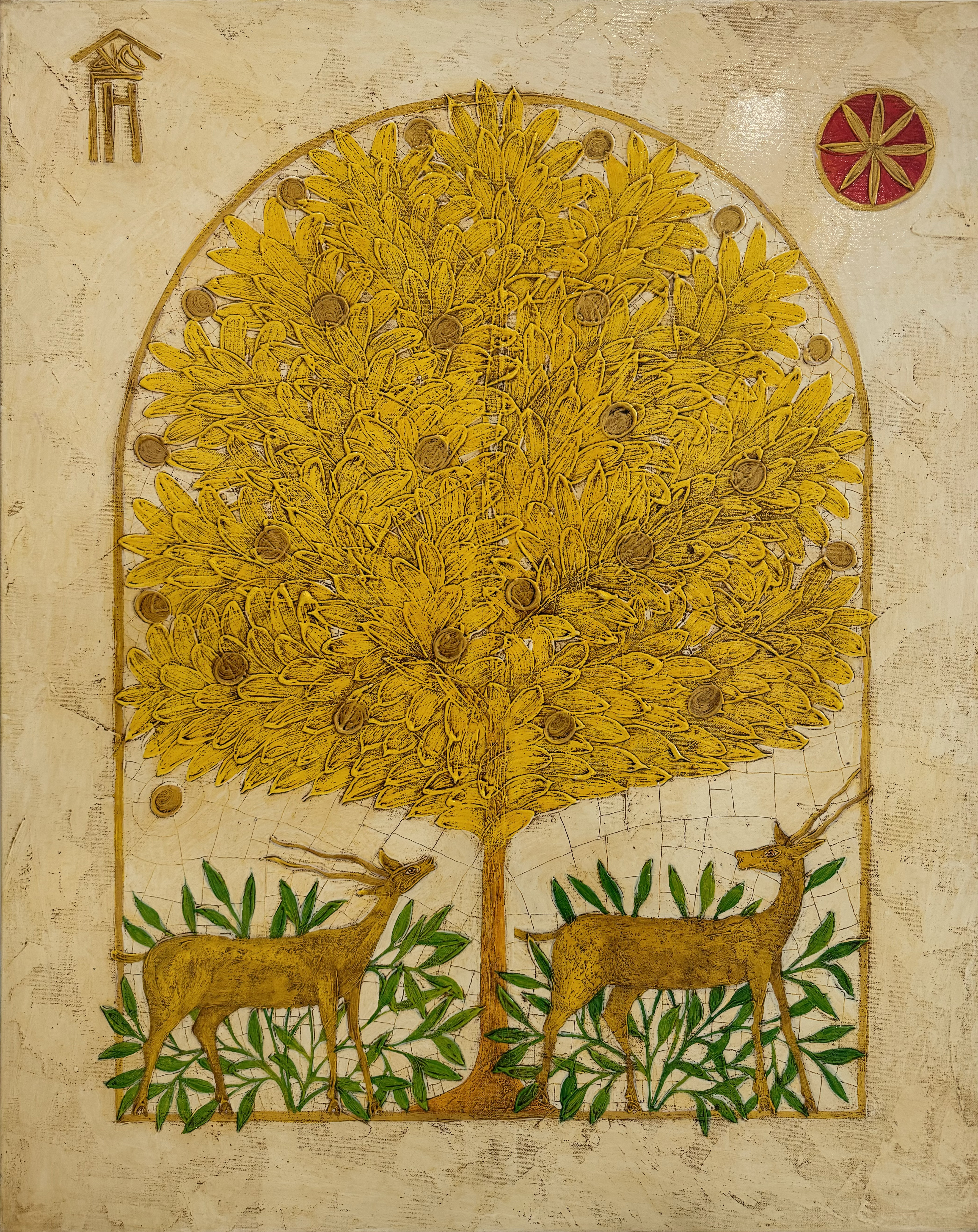 Below, under the tree, are two graceful deer surrounded by green plants. These noble forces symbolize natural harmony, peace and tranquility. Their silhouettes are made in the style of ancient frescoes, which gives the painting a special atmosphere of sublimity.