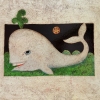 This painting is executed in an original stylized style, harmoniously combining elements of painting and relief. In the center of the composition is a white whale with a friendly smile, emerging from the sea waves. Its massive body becomes the focus of attention, while the background is divided into two contrasting parts: a dark night sky with a tiny luminous element reminiscent of the solar disk, and a green water surface decorated with swirls symbolizing sea waves.