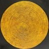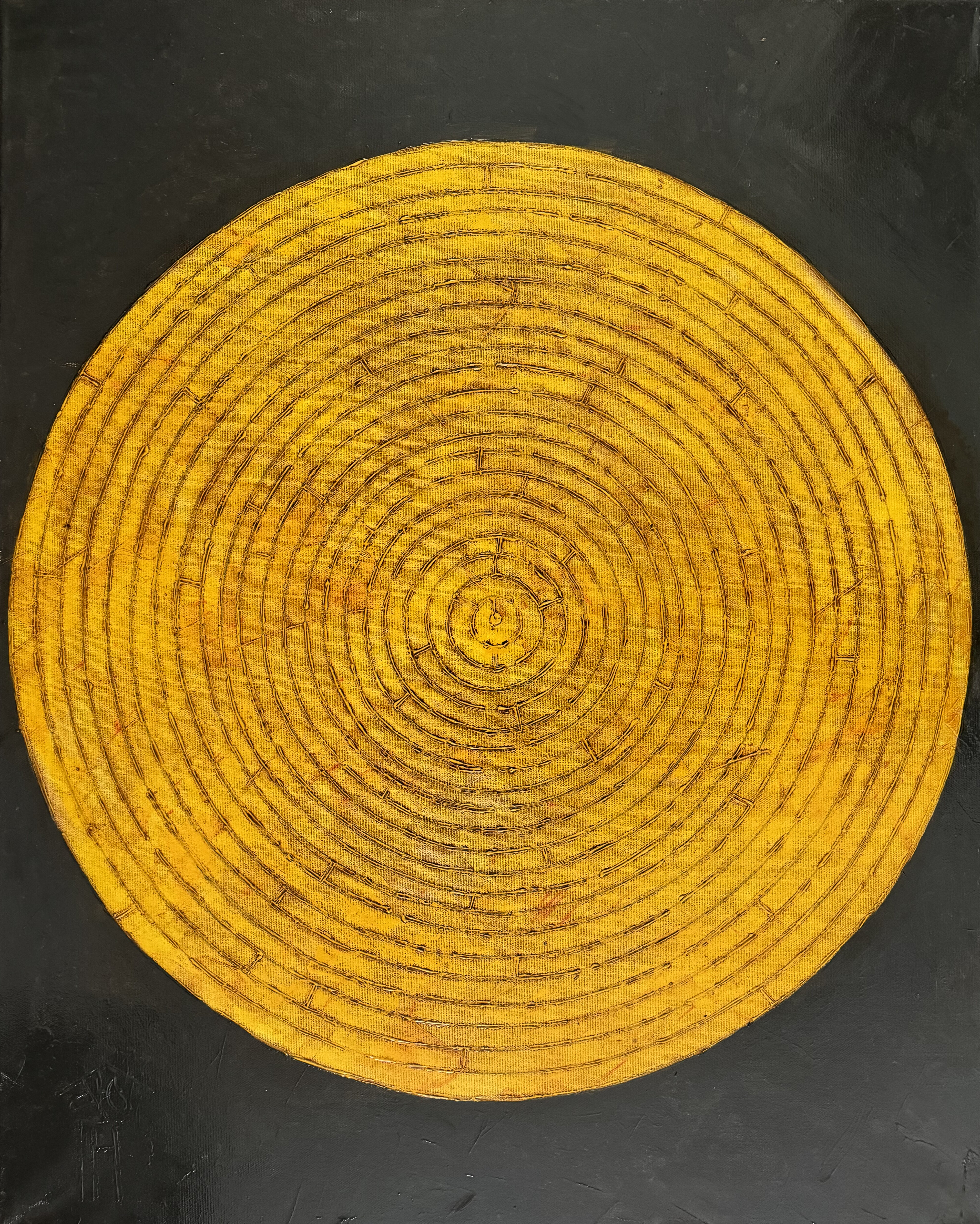 The painting features a large yellow circle, made using the textured painting technique. Concentric circles are formed inside it, creating the effect of hypnotic movement. The bright golden hue symbolizes energy and warmth, and the rough texture adds a sense of antiquity.