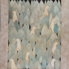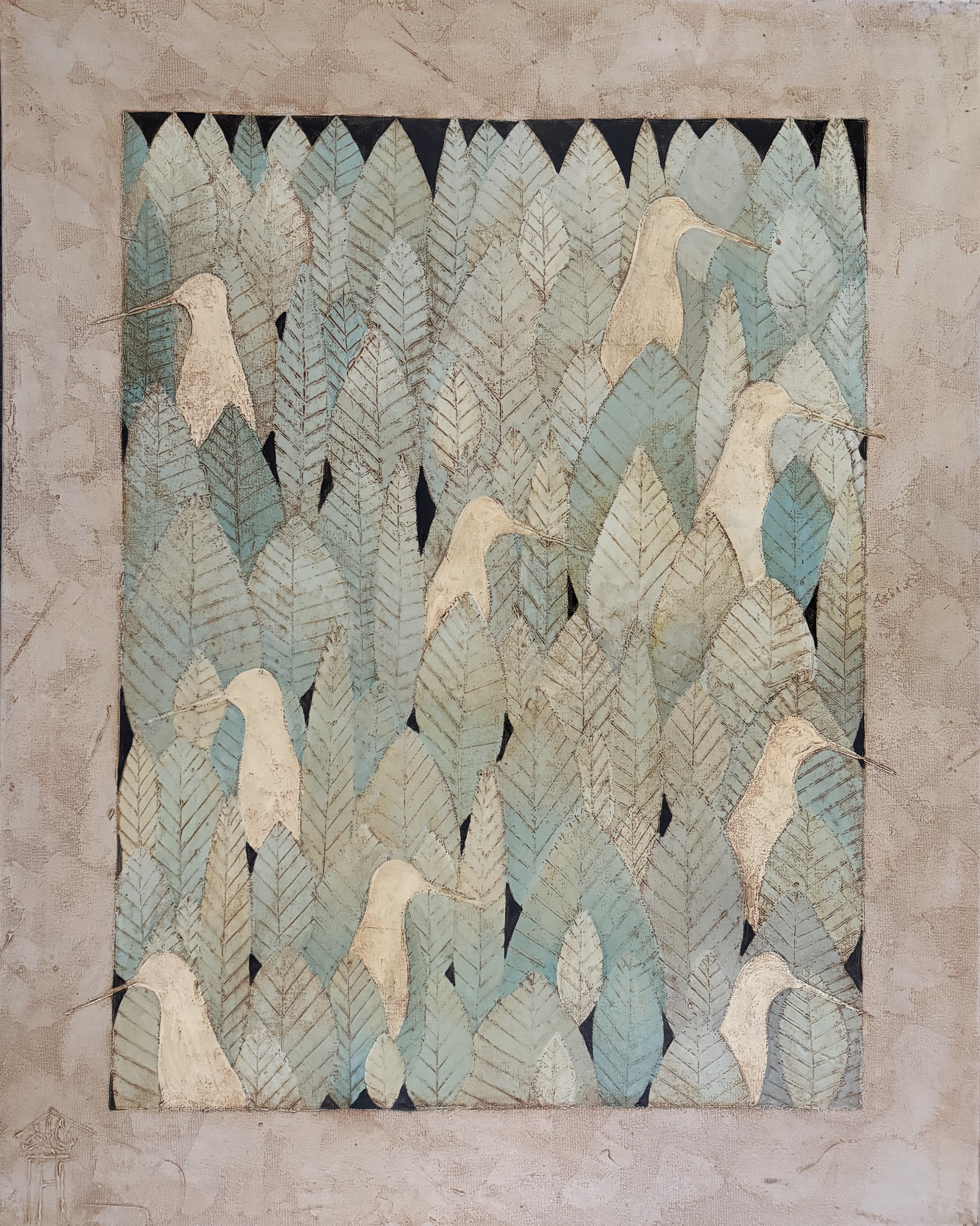 This work is an elegant composition in which natural elements and silhouettes of birds are organically intertwined. Against the background of thick, stylized leaves in delicate pastel colors, the outlines of light birds are guessed, which seem to dissolve in the foliage, creating the effect of unity with nature.
